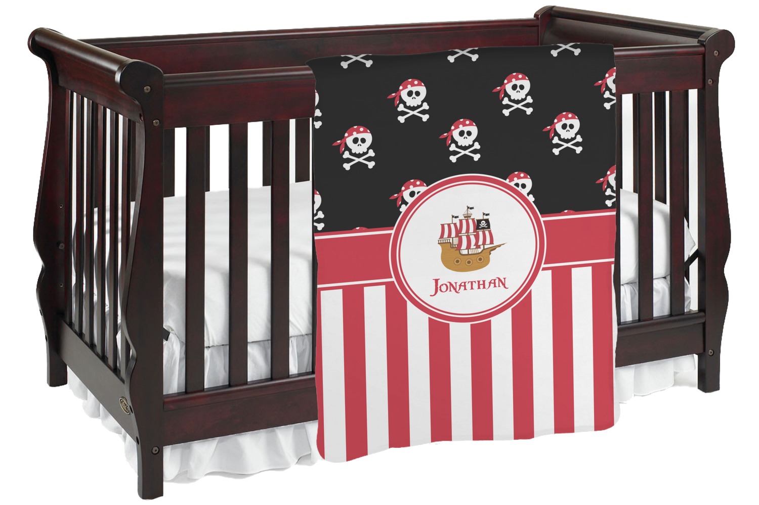 Pillage and plunder is the name of the game with this pirate design. Set on a backdrop of black, the skull and crossbones, sporting red and white polka dot dew rags, are the showcase in this design. A coordinating red and white striped pattern on the bottom that has been taken from the sails of the ship tie the entire design together. A wide band of red trimmed in white bring these classic colors together.