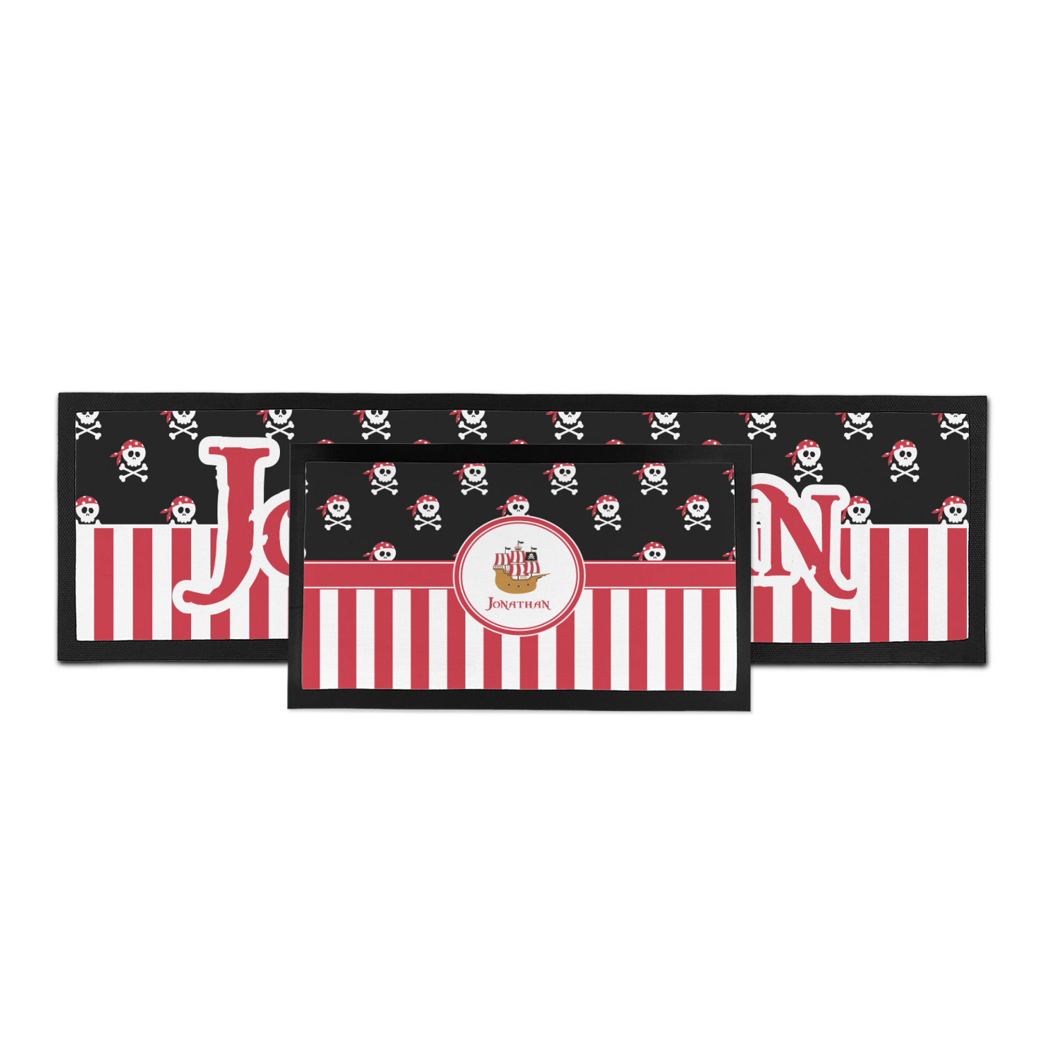 Pillage and plunder is the name of the game with this pirate design. Set on a backdrop of black, the skull and crossbones, sporting red and white polka dot dew rags, are the showcase in this design. A coordinating red and white striped pattern on the bottom that has been taken from the sails of the ship tie the entire design together. A wide band of red trimmed in white bring these classic colors together.