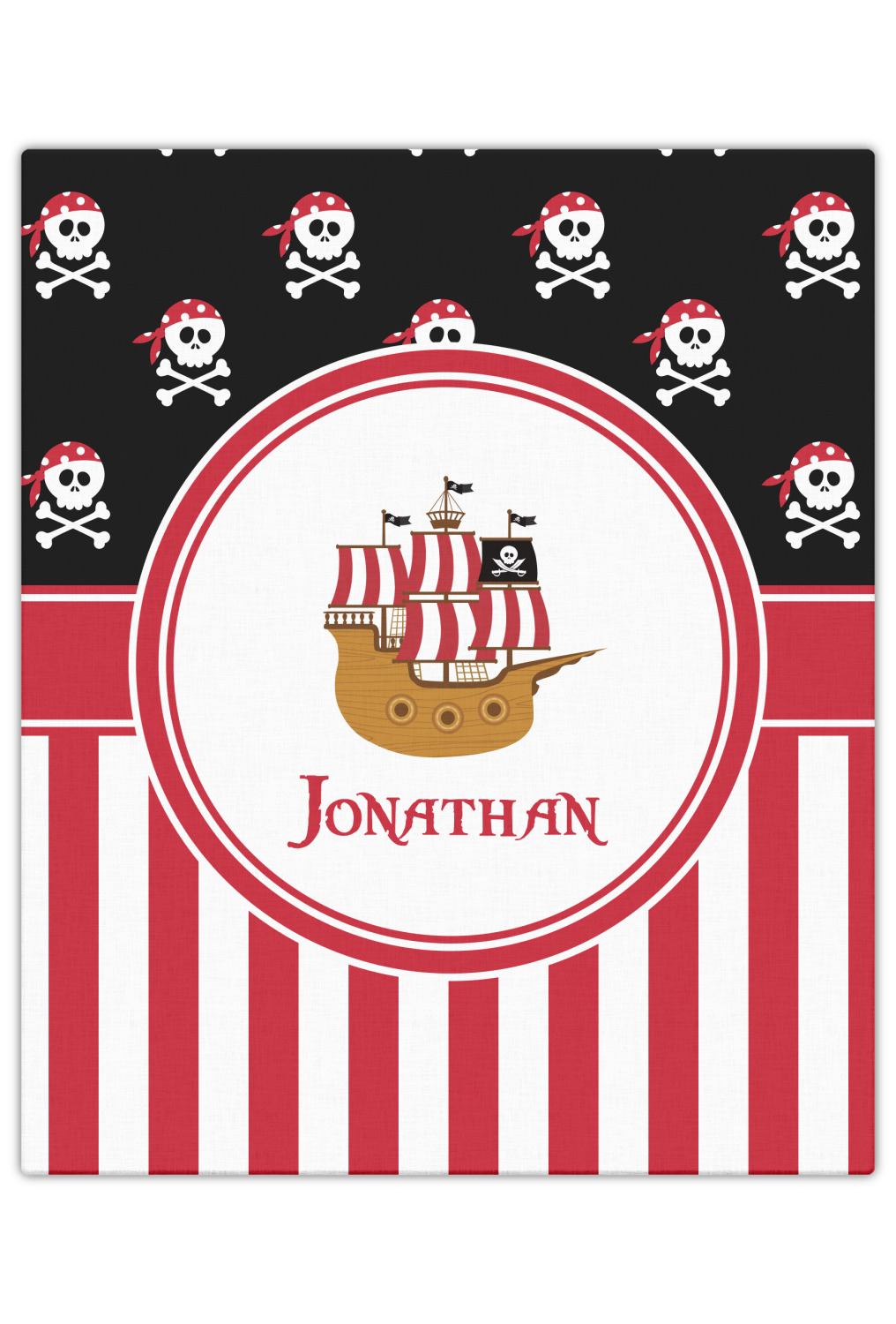 Pillage and plunder is the name of the game with this pirate design. Set on a backdrop of black, the skull and crossbones, sporting red and white polka dot dew rags, are the showcase in this design. A coordinating red and white striped pattern on the bottom that has been taken from the sails of the ship tie the entire design together. A wide band of red trimmed in white bring these classic colors together.