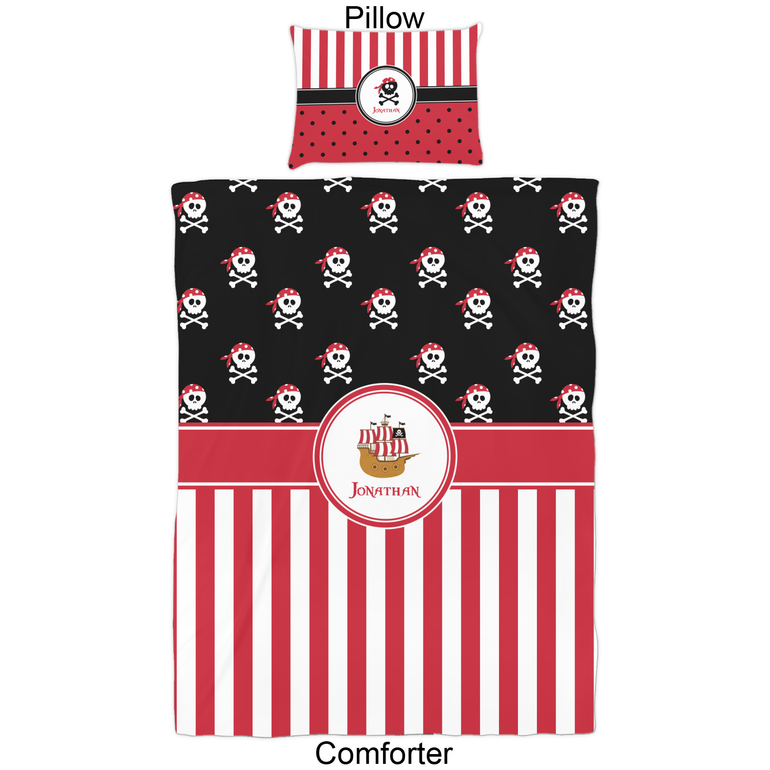 Pillage and plunder is the name of the game with this pirate design. Set on a backdrop of black, the skull and crossbones, sporting red and white polka dot dew rags, are the showcase in this design. A coordinating red and white striped pattern on the bottom that has been taken from the sails of the ship tie the entire design together. A wide band of red trimmed in white bring these classic colors together.