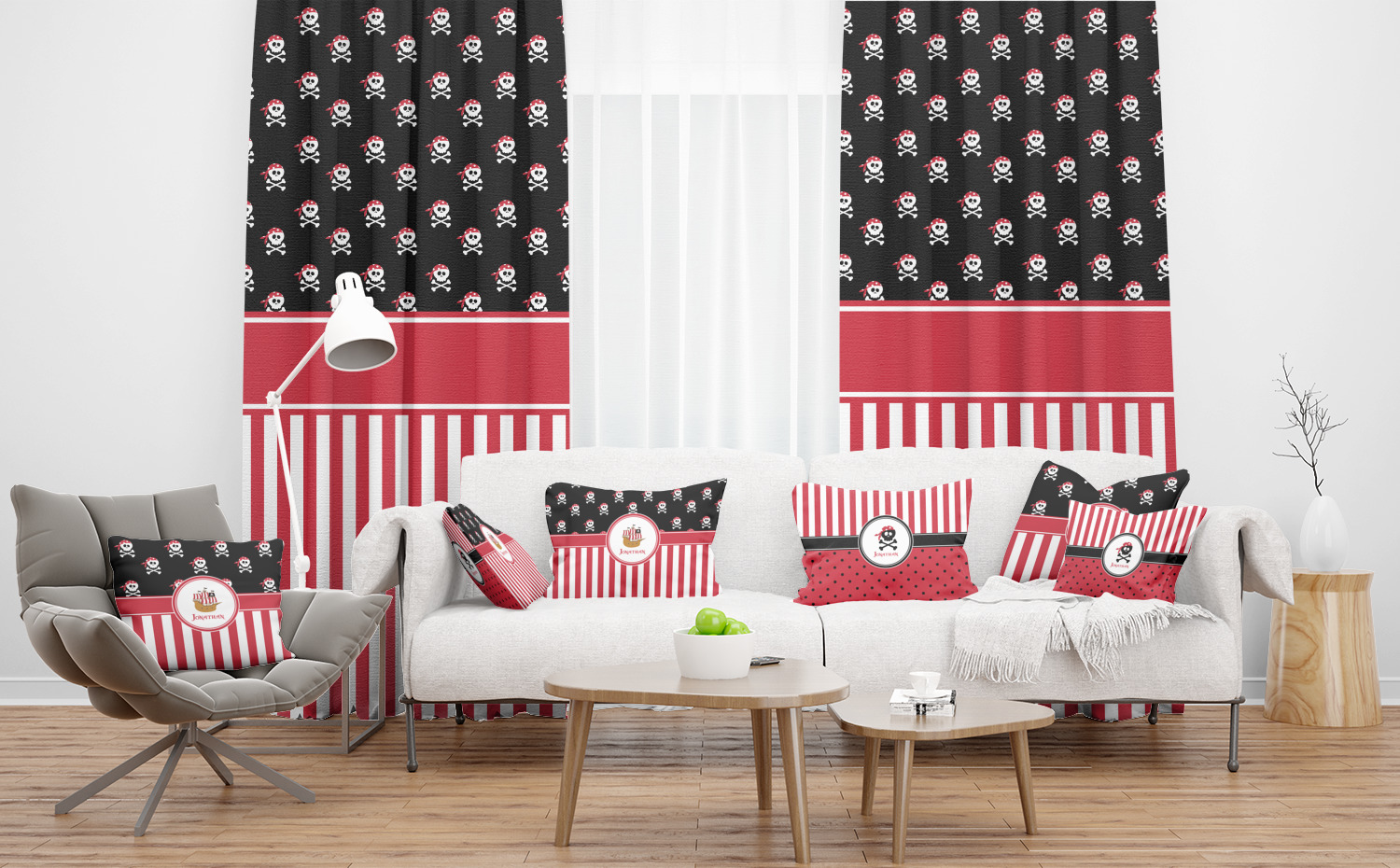 Pillage and plunder is the name of the game with this pirate design. Set on a backdrop of black, the skull and crossbones, sporting red and white polka dot dew rags, are the showcase in this design. A coordinating red and white striped pattern on the bottom that has been taken from the sails of the ship tie the entire design together. A wide band of red trimmed in white bring these classic colors together.