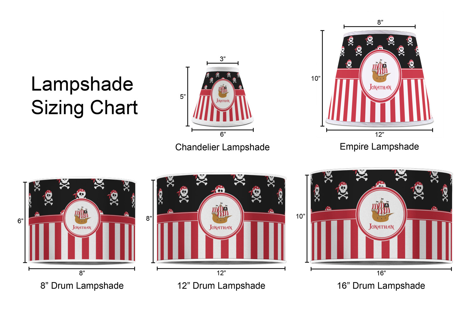 Our customized lamp shades also come in 3 different sizes: 8", 12" and 16", measuring at 8" in diameter by 6" tall, 12" in diameter by 8" tall, and 16" in diameter by 10" tall, respectively.