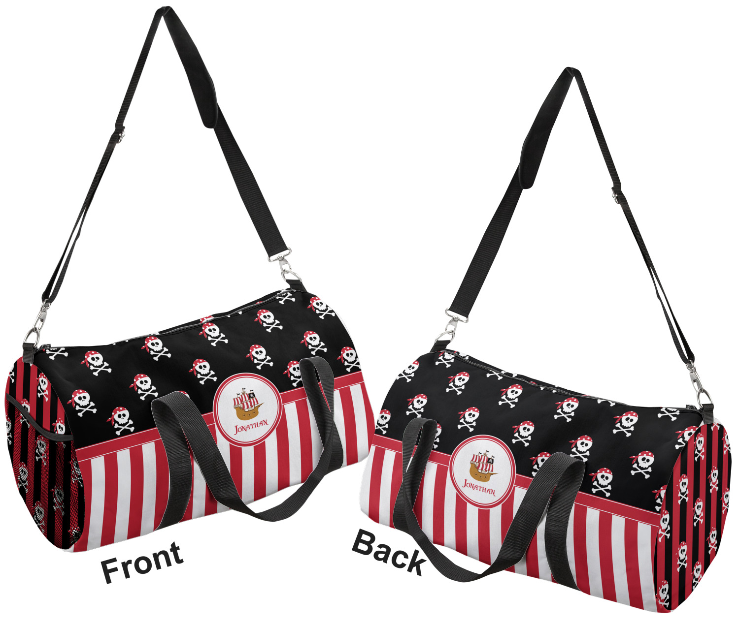 This duffle is a sturdy bag made of a canvas material. It comes in two sizes: Small (19"W x 9.5"H x 9.5"D) and Large (23"W x 12"H x 12"D). The bag is a cylindrical shape with a black adjustable strap and two handles. On one side is an elastic pouch to put a waterbottle or other small item. Your product will be sublimated with your design and is able to be designed on the front, back, and sides. Be sure to remember that the straps may cut into parts of your design if you upload your own artwork.