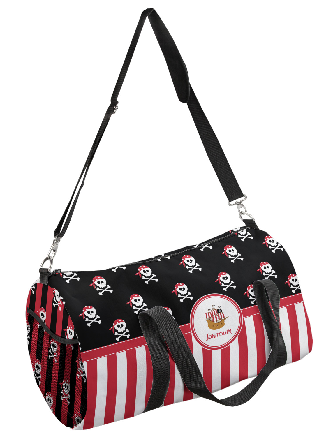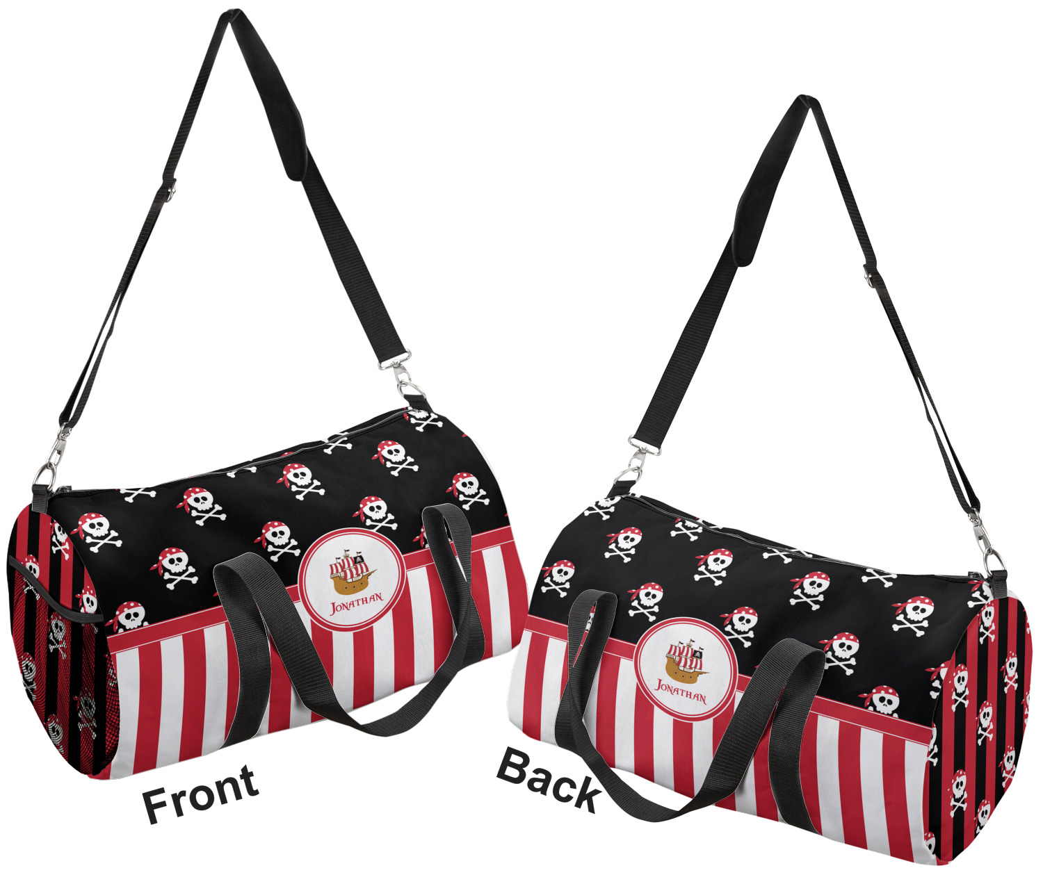 This duffle is a sturdy bag made of a canvas material. It comes in two sizes: Small (19"W x 9.5"H x 9.5"D) and Large (23"W x 12"H x 12"D). The bag is a cylindrical shape with a black adjustable strap and two handles. On one side is an elastic pouch to put a waterbottle or other small item. Your product will be sublimated with your design and is able to be designed on the front, back, and sides. Be sure to remember that the straps may cut into parts of your design if you upload your own artwork.