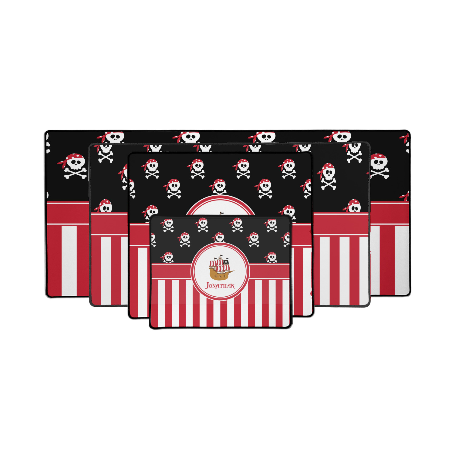Pillage and plunder is the name of the game with this pirate design. Set on a backdrop of black, the skull and crossbones, sporting red and white polka dot dew rags, are the showcase in this design. A coordinating red and white striped pattern on the bottom that has been taken from the sails of the ship tie the entire design together. A wide band of red trimmed in white bring these classic colors together.