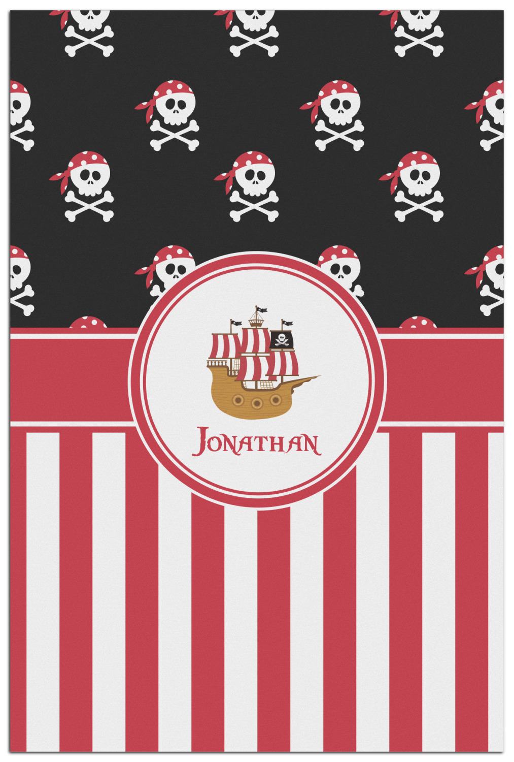 Pillage and plunder is the name of the game with this pirate design. Set on a backdrop of black, the skull and crossbones, sporting red and white polka dot dew rags, are the showcase in this design. A coordinating red and white striped pattern on the bottom that has been taken from the sails of the ship tie the entire design together. A wide band of red trimmed in white bring these classic colors together.
