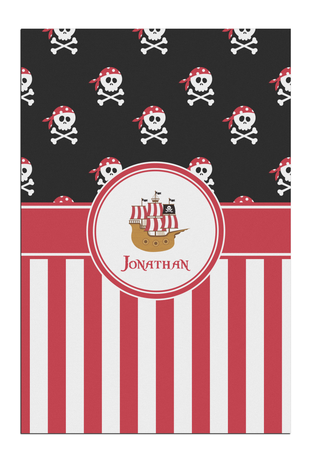 Pillage and plunder is the name of the game with this pirate design. Set on a backdrop of black, the skull and crossbones, sporting red and white polka dot dew rags, are the showcase in this design. A coordinating red and white striped pattern on the bottom that has been taken from the sails of the ship tie the entire design together. A wide band of red trimmed in white bring these classic colors together.