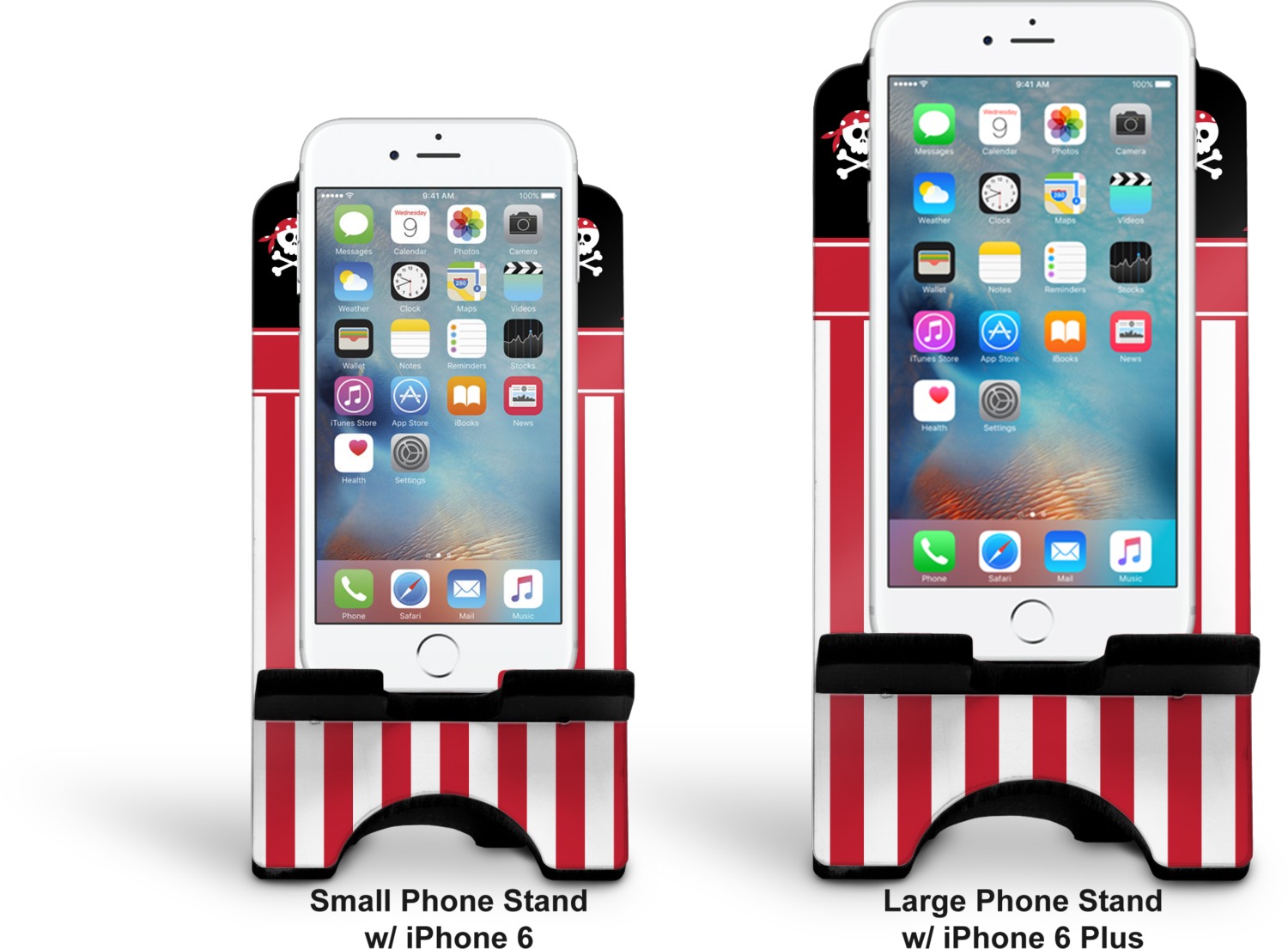 To meet your needs, we offer four variations of this IPhone stand. The backboard of the first version is shaped as a plain, yet sleek rectangle, and is available in two sizes. Our smaller size is approximately 4 by 3.25 by 7 inches, while the larger model is 4 by 3.77 by 8.5 inches. Alongside this model, we also provide you with a more decorative option. The upper part of our second version features a curved edge, for a classy, suave appearance. This phone holder is also sold in two sizes: a smaller version, which is 4 by 3.25 by 7 inches, and our larger model, which is 4 by 3.77 by 8.5 inches. Both models will support large phones, but the larger model is better if you wish to proudly display your personalized design.