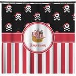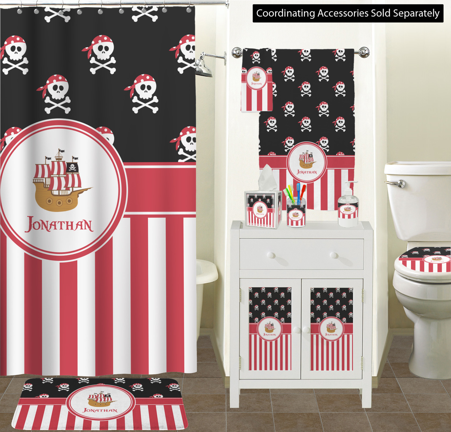 Pillage and plunder is the name of the game with this pirate design. Set on a backdrop of black, the skull and crossbones, sporting red and white polka dot dew rags, are the showcase in this design. A coordinating red and white striped pattern on the bottom that has been taken from the sails of the ship tie the entire design together. A wide band of red trimmed in white bring these classic colors together.