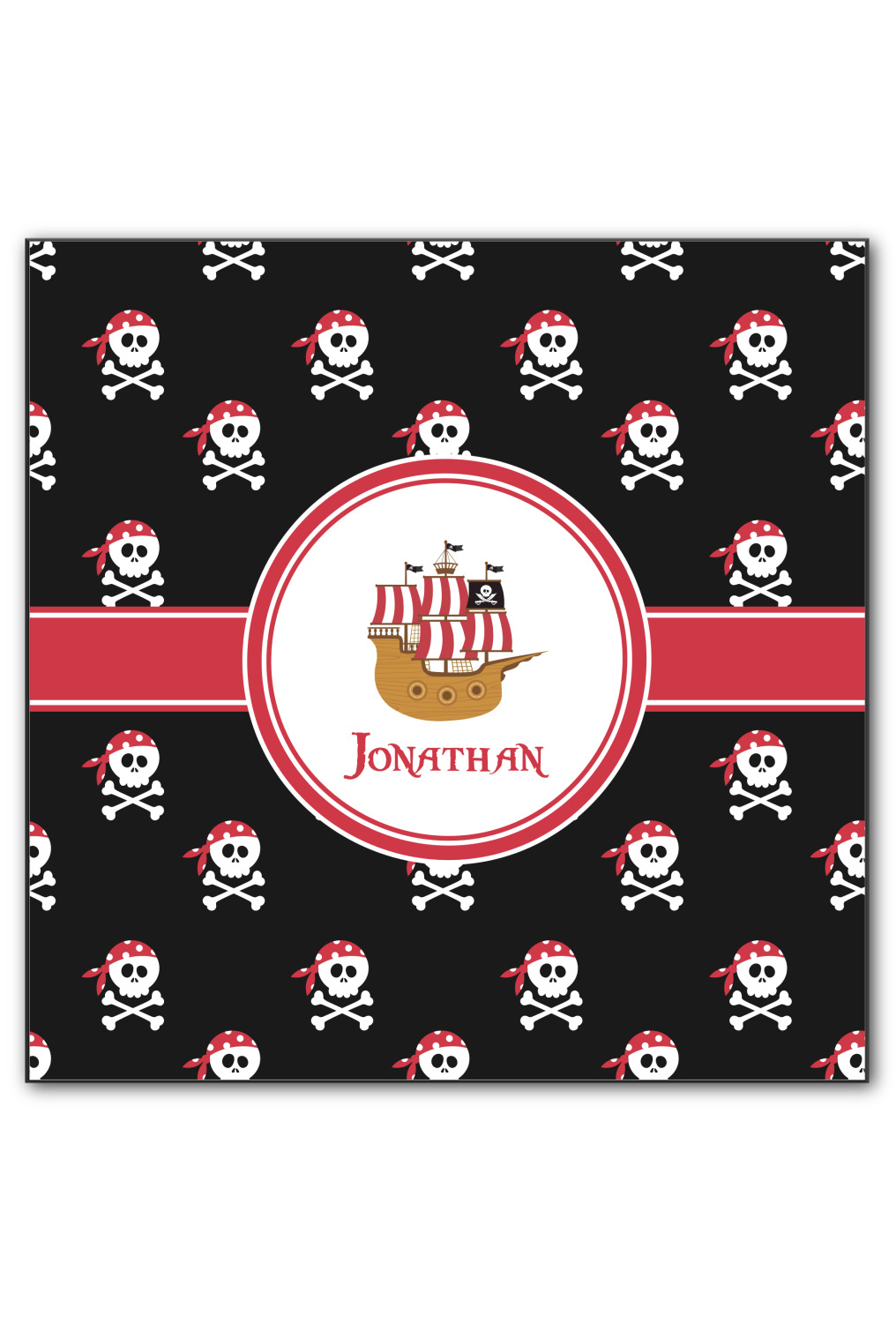 Pillage and plunder is the name of the game with this pirate design. Set on a backdrop of black, the skull and crossbones, sporting red and white polka dot dew rags, are the showcase in this design. A wide band of red trimmed in white bring these classic colors together.