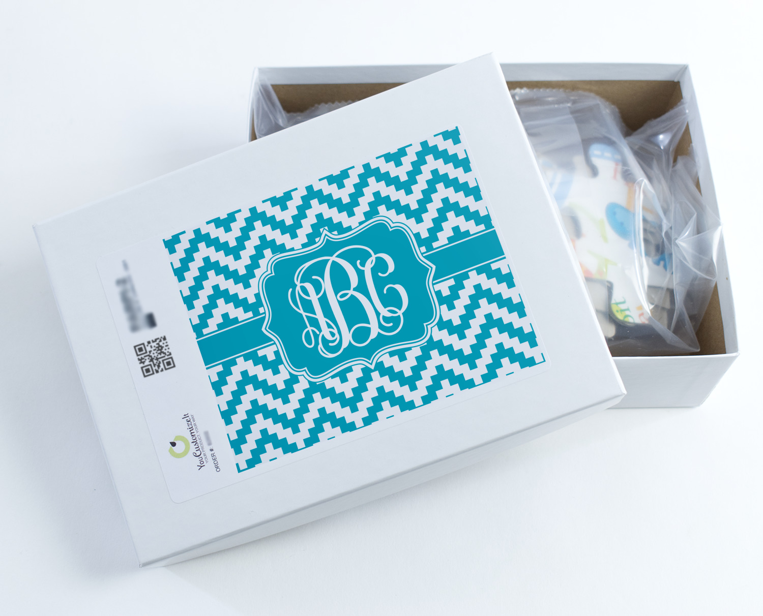 Pixelated chevron stripe is at the tipping point of cool designs. I used the teal color to create the design as it is also one of my favorite colors, however, the design is available in multiple colors. The center has a classic ribbon and I used the decorative label filled in teal with the interlocking monogram in white!