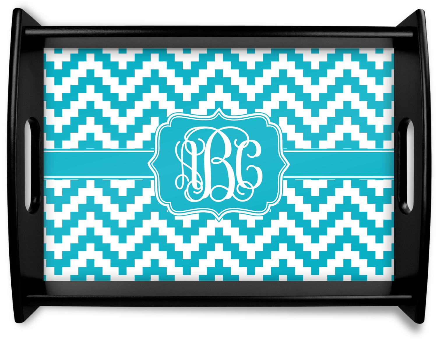 This serving tray with handles features square edges and two rounded sides, creating a very modern look. Each side is fabricated from a beautifully cut, natural wood. The bottom of the interior of the tray displays your customized design in bright, vibrant color. The tray is sold in both a black color and a natural wood look. Each variation of the wood serving tray has two sizes: Small, which is 14" x 10" x 2.25", and Large, which is 19.5" x 13.5" x 2.75".
