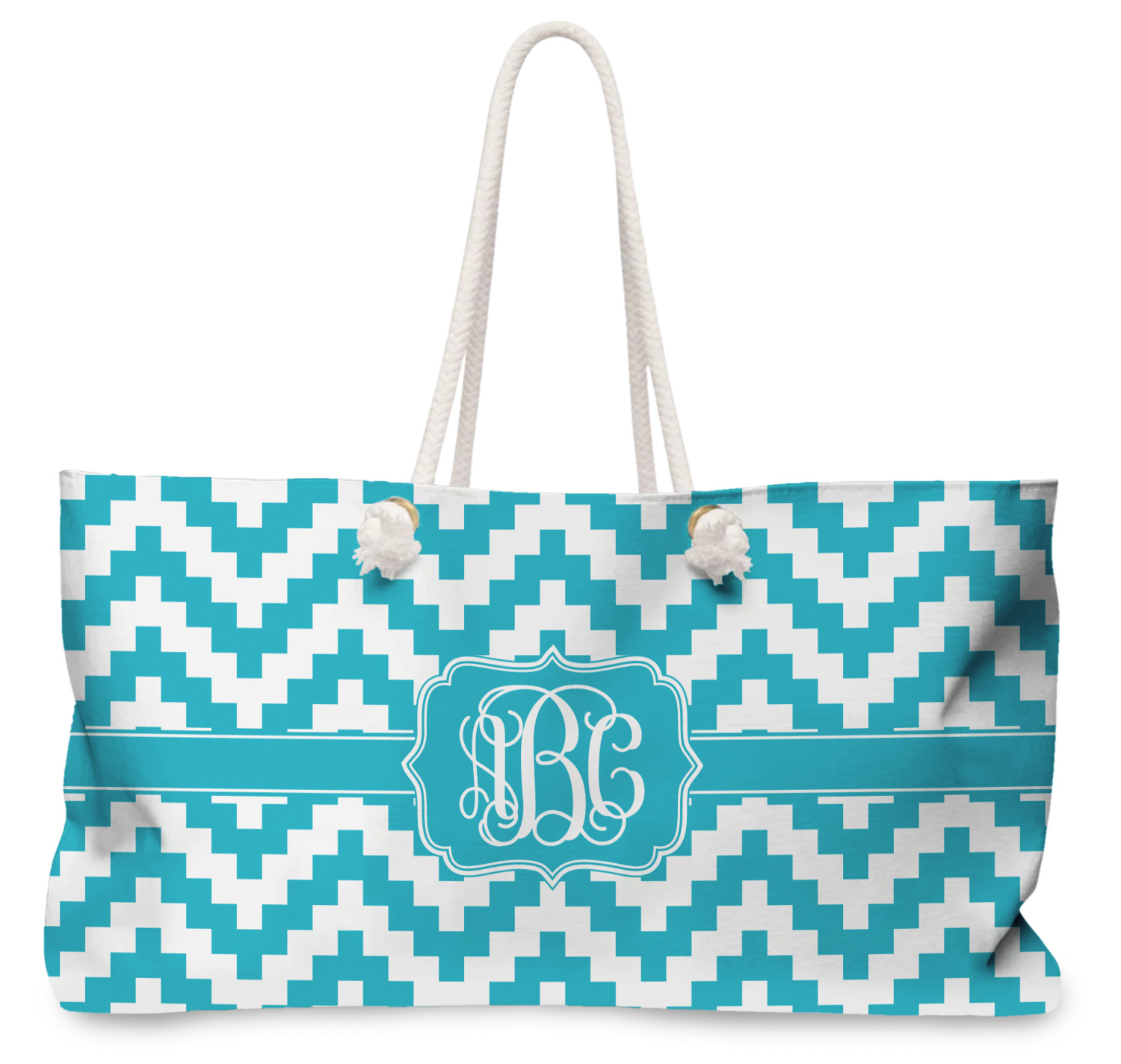 Our oversized weekender tote with rope handles is perfect for your weekend at the beach or on the town. This large tote are 24" W X 13" H, with a 5" gusset and a 27" thick rope handles with a knot that is put through a grommeted brass hole.