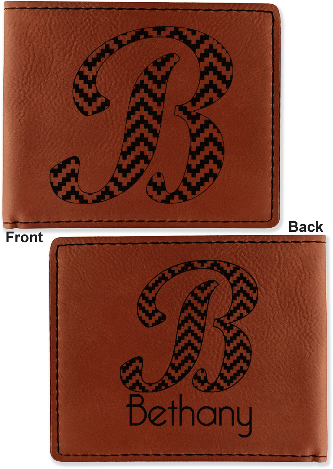 Your bifold wallet will be personalized by laser engraving, which will be a black color on the wallet. Choose a graphic, text, or monogram to personalize your wallet. There are thousands of choices in our design center.