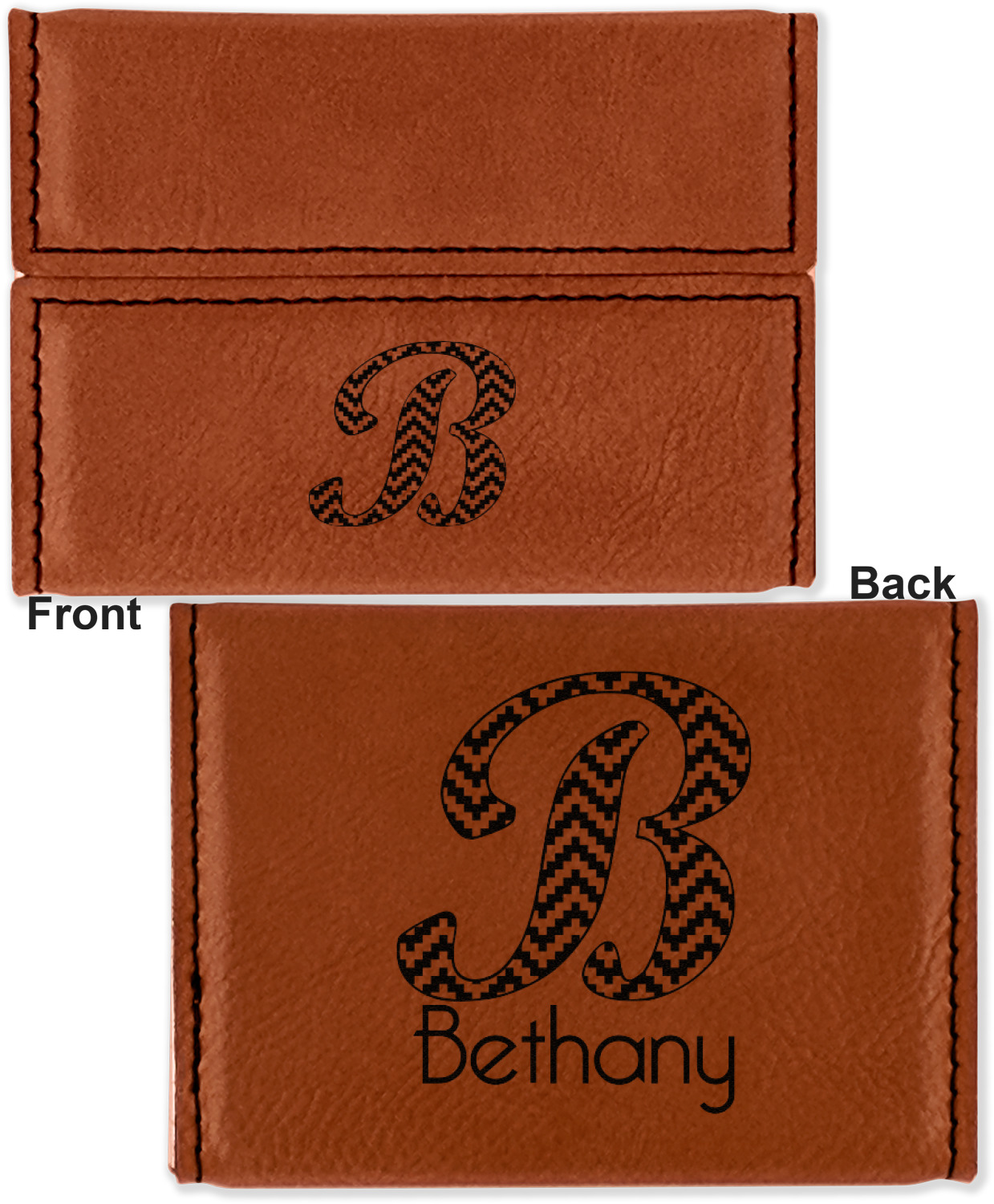 Your personalized design is laser engraved onto either the front, or the front and back of the card holder, depending on the model you purchase. Once engraved, the design will appear a darkened black against the cognac color of the leatherette.