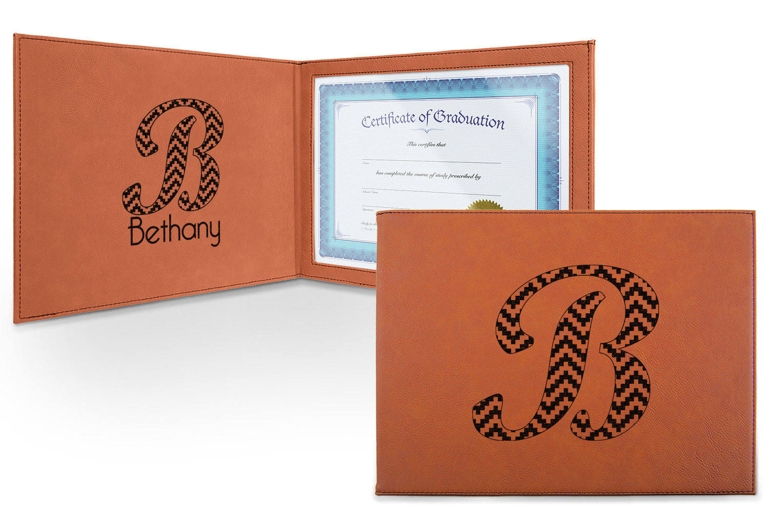This cognac-colored, leatherette certificate jacket is the ideal way to display or store your hard-earned certificate. When closed, the custom certificate holder measures at 12 by 9 inches. The interior of the certificate cover includes a clear, vinyl window to encase your diploma. The window measures at around 10.5 by 7.5 inches and can accommodate a diploma that measures at up to 8.5 by 11 inches. You can either choose to have your customization laser engraved on the front and interior, or solely the front.