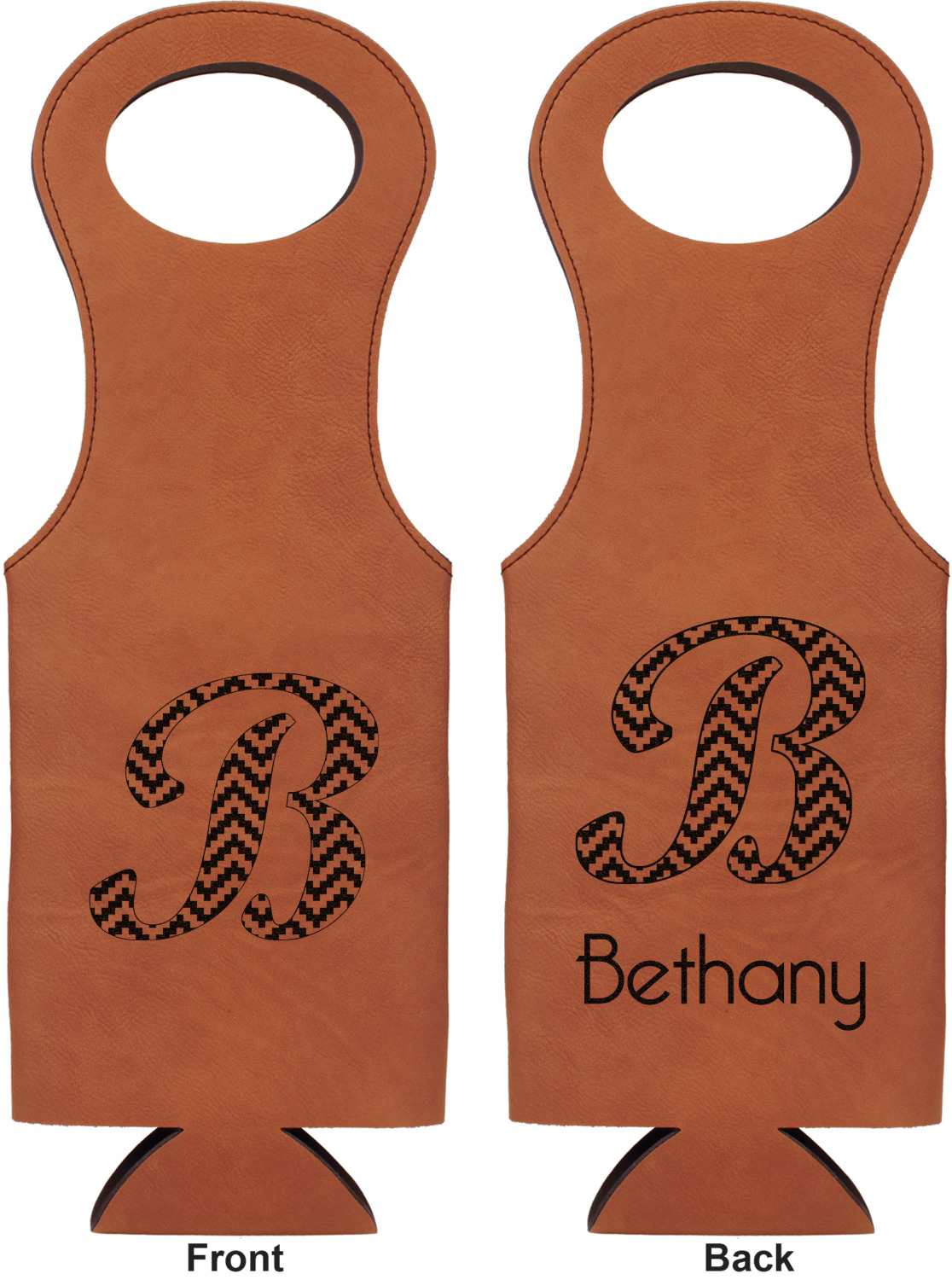 This wine carrier is made from a stunning leatherette, in a cognac-brown color. Strong, black stitching lines the sides of your wine bottle bag and provides extra durability. The interior is lined with a padded, black material to allow for a snug fit once your bottle is placed inside. At the top of this wine gift bag, you'll find two oval shaped handles that elegantly complements the rest of the bag's style. We provide you with the option of laser-engraving the front, or the front and back of your new personalized wine bag!