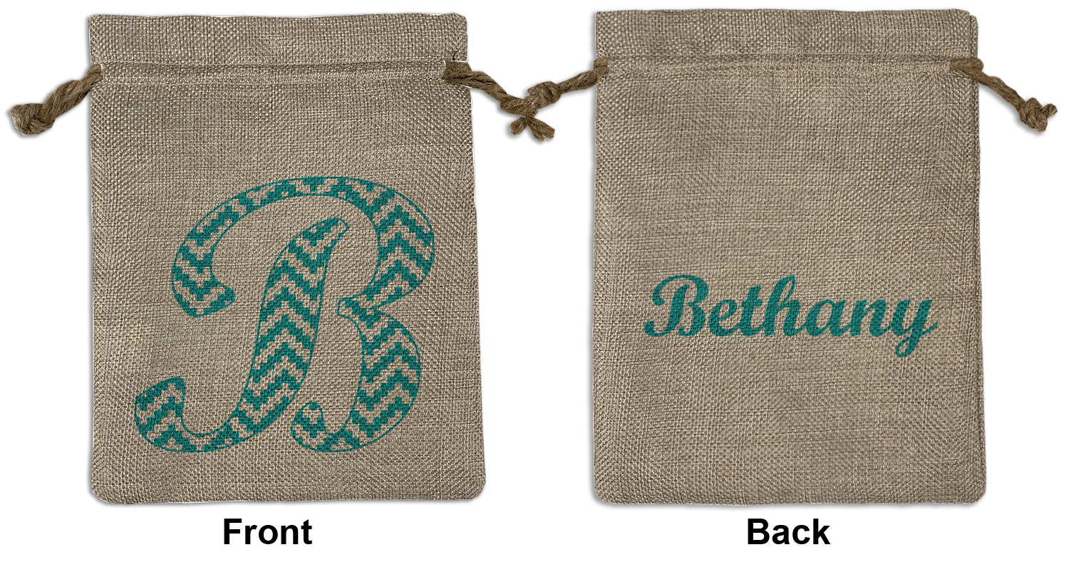 We sell our Burlap Gift Bags in 3 variant sized bags. Made with burlap polyester, each personalized bag can be secured with a twine drawstring pull. Your custom design is available to print on one side or both sides - completely up to you! The sizes of the bags measure approximately 4.5" x 6.5" for the smallest size, 6.5" x 8.0" for the medium size, and 6.5" x 13.5" for the large-sized bag.