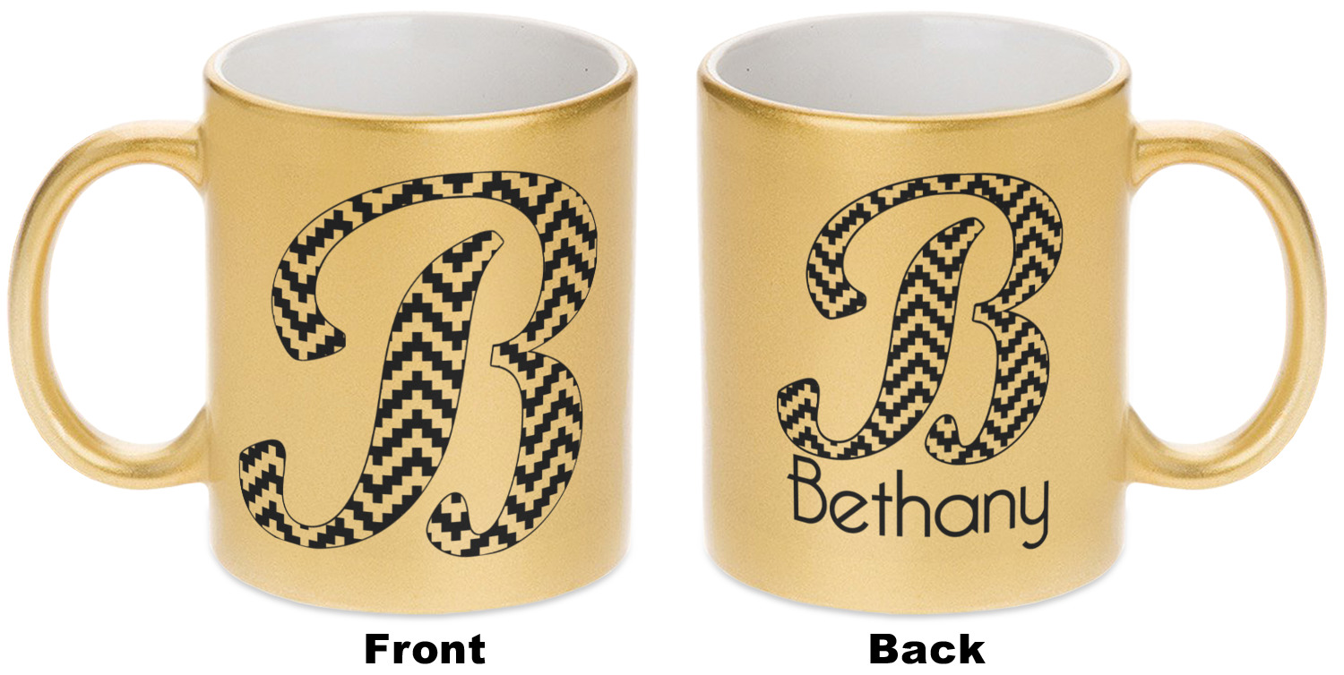 Our custom mugs are ceramic, which is great for keeping your tea or coffee warm! We offer two metallic mugs to personalize - Silver or Gold. Both styles hold around 11oz and have dimensions of approximately 3.75" x 3.5" x 4.75". Both the metallic mugs come in a matte finish and have glitter detailing to add a more pristine feel to the gold and silver base colors.