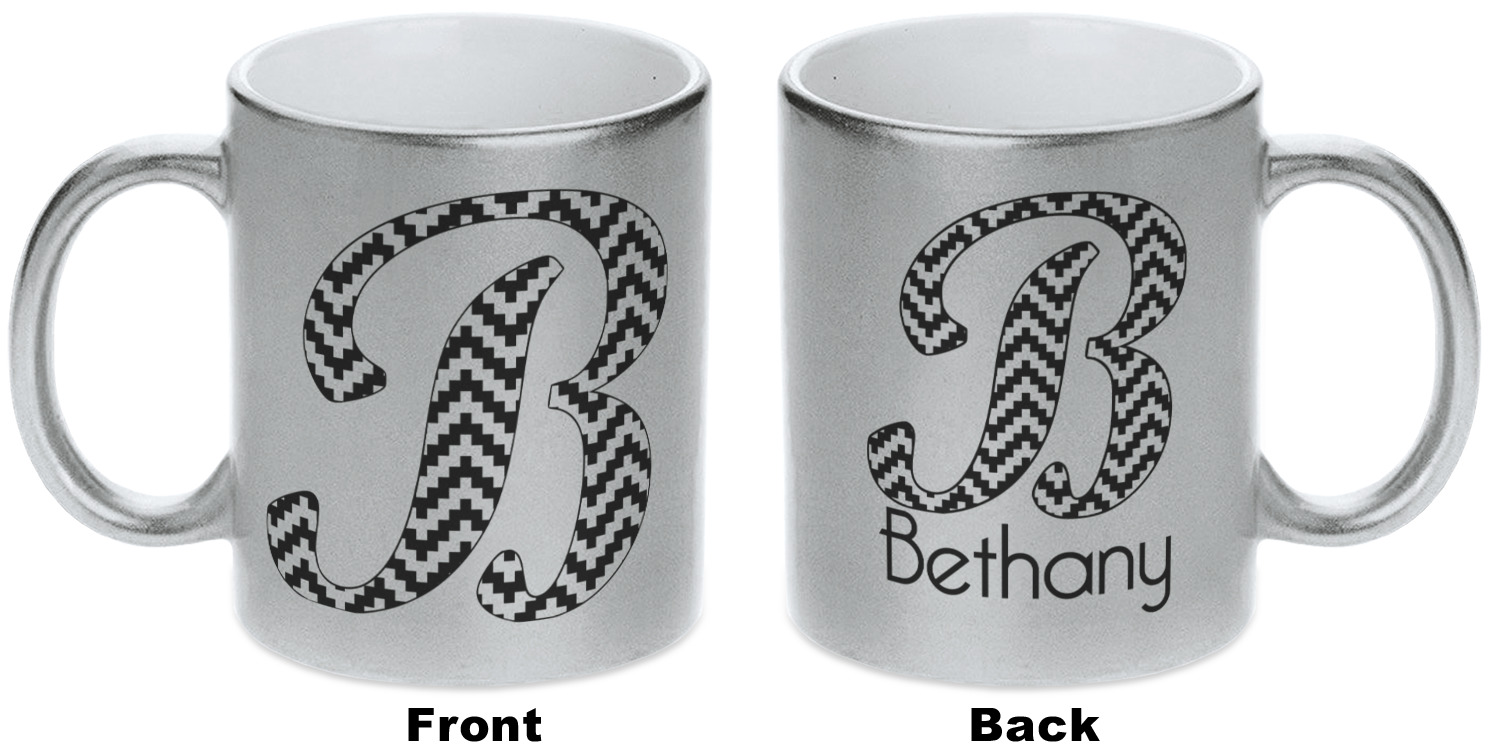 Our custom mugs are ceramic, which is great for keeping your tea or coffee warm! We offer two metallic mugs to personalize - Silver or Gold. Both styles hold around 11oz and have dimensions of approximately 3.75" x 3.5" x 4.75". Both the metallic mugs come in a matte finish and have glitter detailing to add a more pristine feel to the gold and silver base colors.