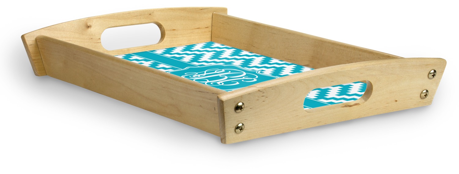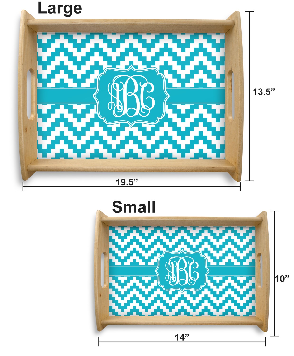 This serving tray with handles features square edges and two rounded sides, creating a very modern look. Each side is fabricated from a beautifully cut, natural wood. The bottom of the interior of the tray displays your customized design in bright, vibrant color. The tray is sold in both a black color and a natural wood look. Each variation of the wood serving tray has two sizes: Small, which is 14" x 10" x 2.25", and Large, which is 19.5" x 13.5" x 2.75".