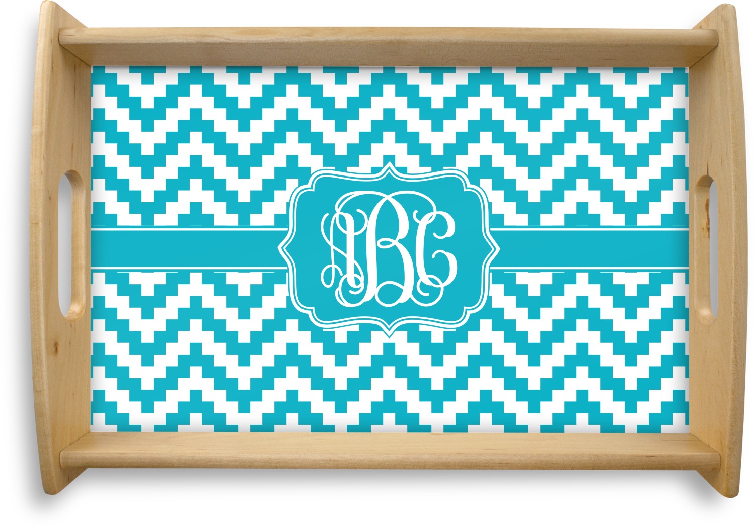 This serving tray with handles features square edges and two rounded sides, creating a very modern look. Each side is fabricated from a beautifully cut, natural wood. The bottom of the interior of the tray displays your customized design in bright, vibrant color. The tray is sold in both a black color and a natural wood look. Each variation of the wood serving tray has two sizes: Small, which is 14" x 10" x 2.25", and Large, which is 19.5" x 13.5" x 2.75".