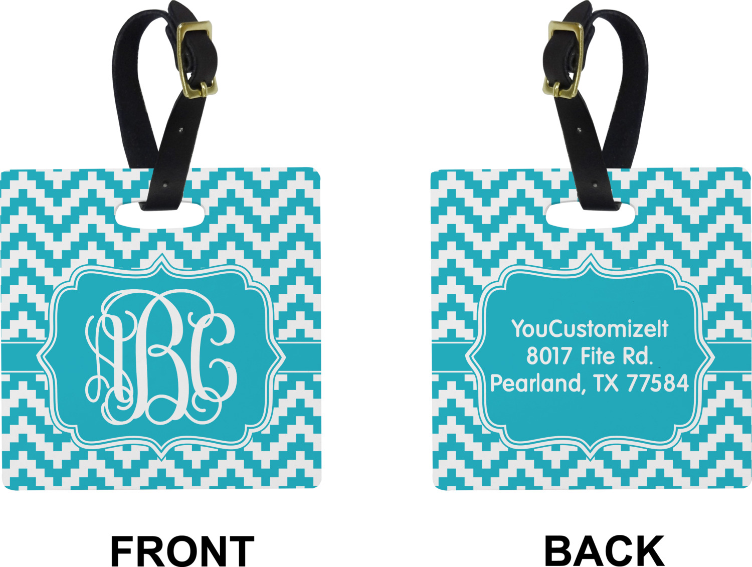 These personalized bag tags are sold in a variety of shapes, so that you may find the product that meets your vision exactly. We sell a round luggage tag, which measures at approximately 4" x 4". Our square luggage tag is about 3.5" x 3.5", while our rectangular version is 2.75" x 4 ".