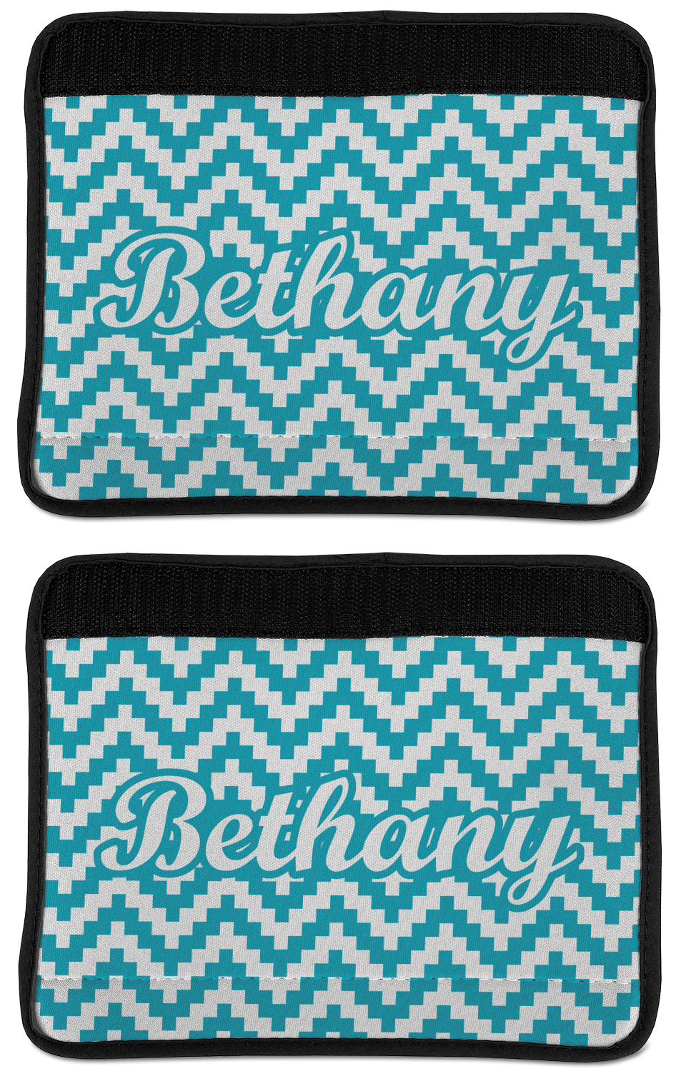 Made from neoprene, our seat belt strap covers wrap around the belt itself and have a Velcro tab for easy attachment and closure. The belt's edges are trimmed with a black polyester for a secure finish. Each cover is 9.5 by 7 inches when open and 9.5 by 2.5 inches when closed. We print your personalized design on the face of the seat belt pad.