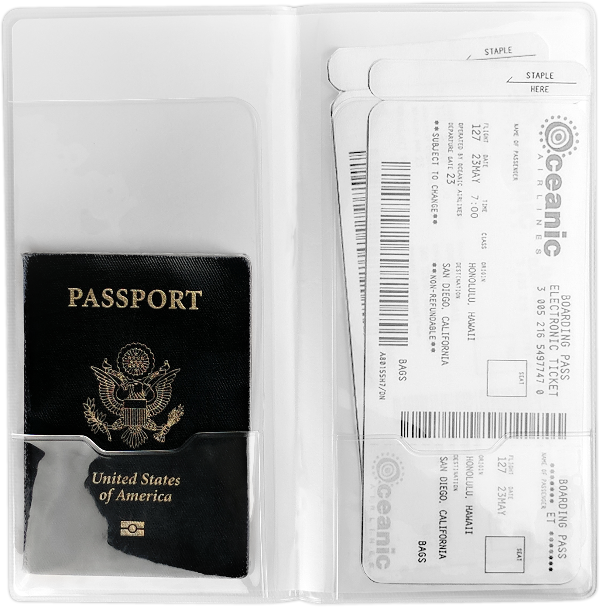 No need for stuffing your boarding pass in one place and your passport in another. Keep your boarding pass, some cash, a card, and your ID or passport all in this one wallet! This 4.5" x 9.125" (9.125" x 9.125" when open) clear vinyl document holder really is the perfect thing for long trips.