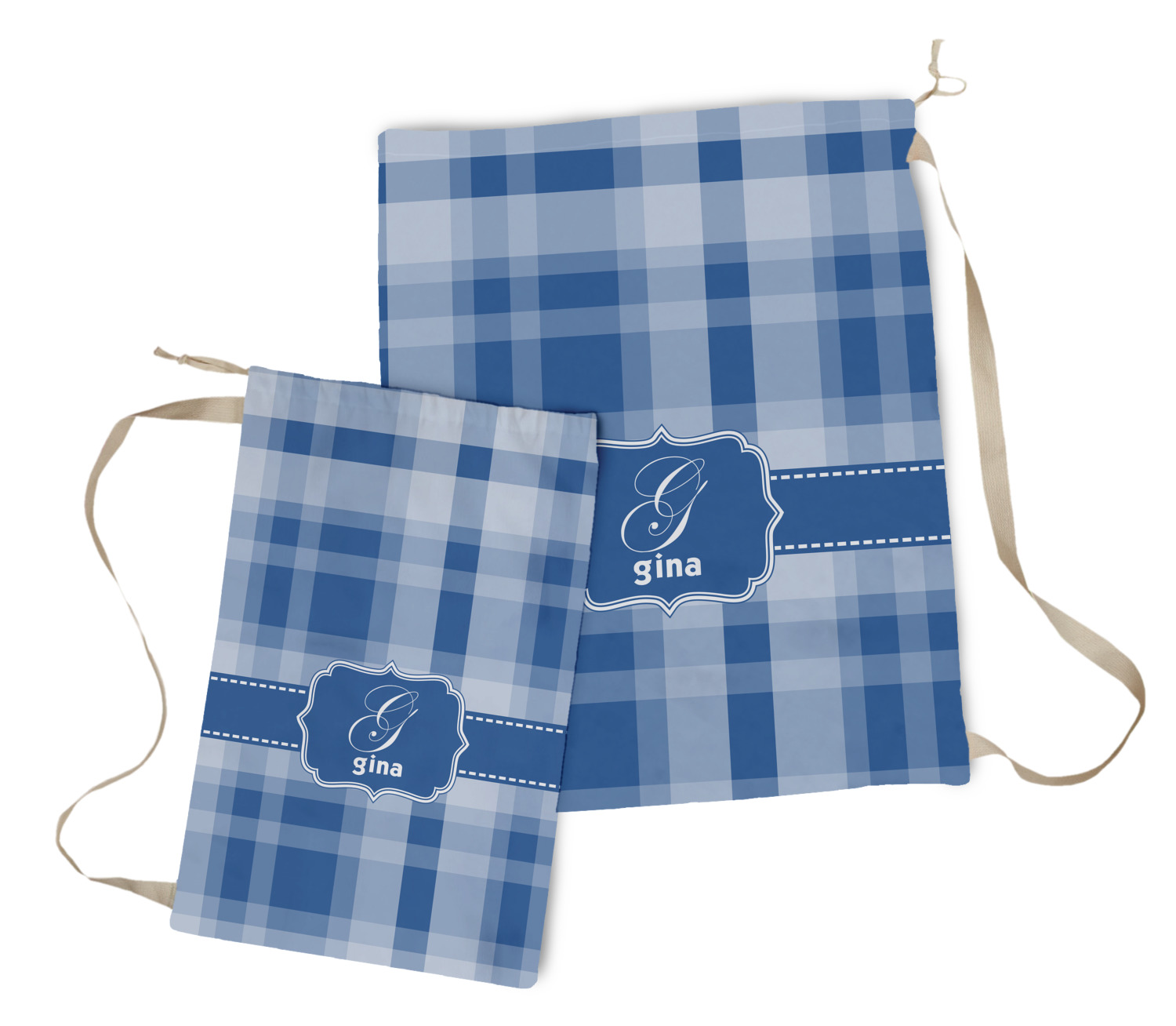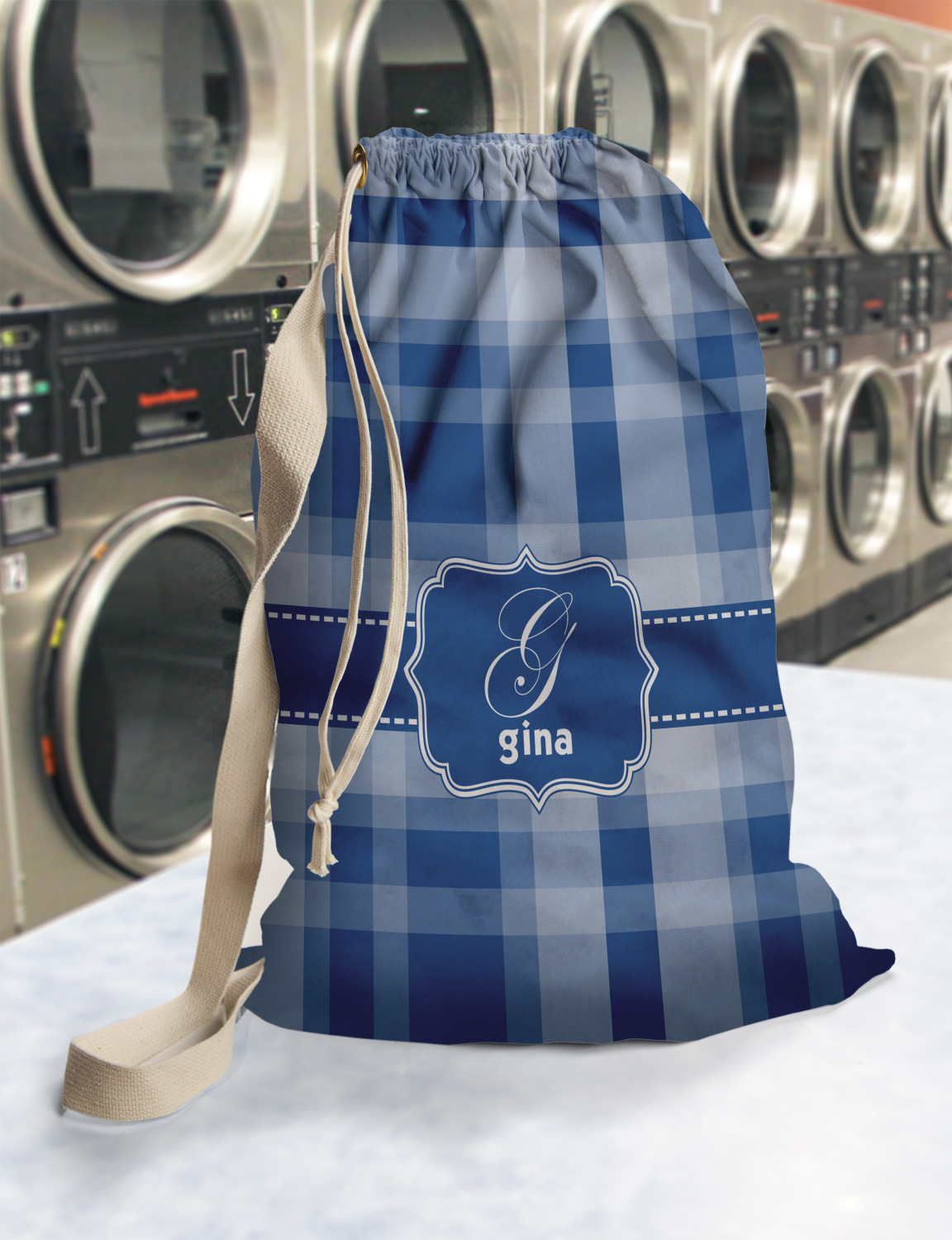 Carry your laundry in style with these customized laundry bags. Available in two sizes, featuring a natural colored woven strap and a cinch cord, these bags hold a lot of clothes or anything else you want to fit in them.