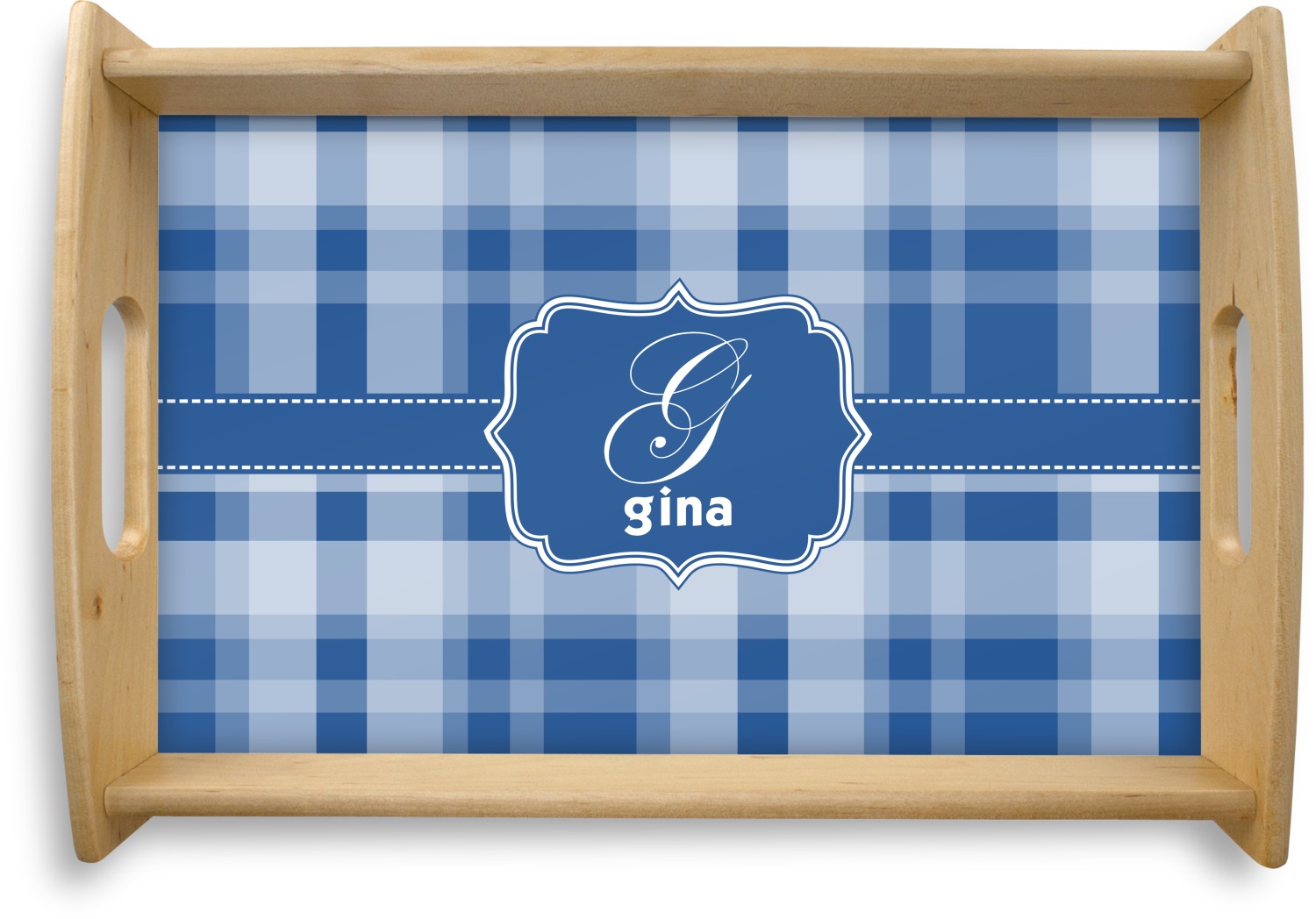 This serving tray with handles features square edges and two rounded sides, creating a very modern look. Each side is fabricated from a beautifully cut, natural wood. The bottom of the interior of the tray displays your customized design in bright, vibrant color. The tray is sold in both a black color and a natural wood look. Each variation of the wood serving tray has two sizes: Small, which is 14" x 10" x 2.25", and Large, which is 19.5" x 13.5" x 2.75".