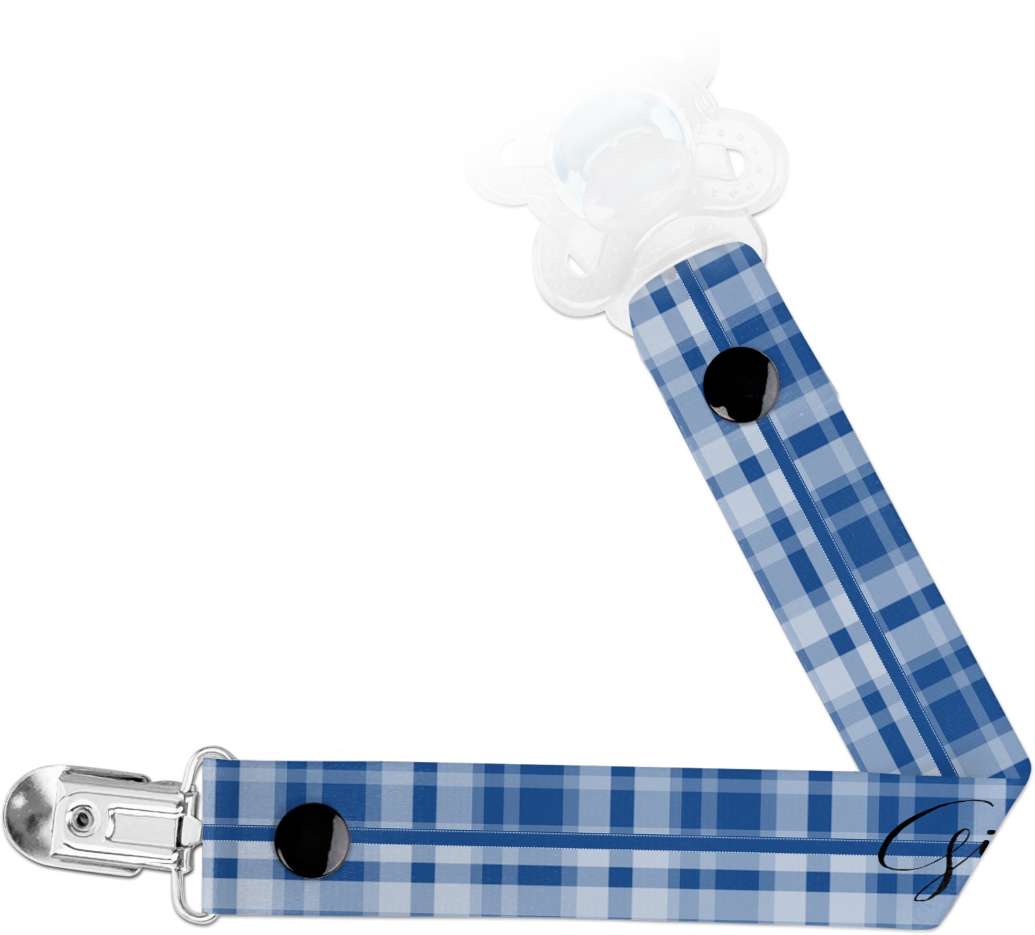 This personalized pacifier clip is the ideal size and measures at approximately 7.5 inches in length, when either end is snapped closed. On one end, you'll find a snap button. This button of your baby's pacifier holder is what can be attached to their pacifier to hold is securely in place. Simply open the snap, slip it through the pacifier opening, and snap it back into place. On the opposite end of this baby pacifier holder, you'll find a metal clip that can secure to a baby's collar or sleeve. This clip ensures that the strap stays in place, and that your baby's pacifier is always on hand.