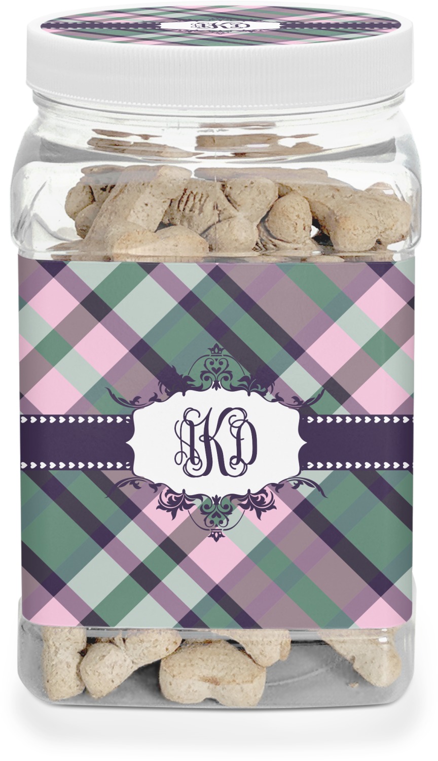 This half gallon jar, made from a sturdy plastic, is the perfect way to keep treats from any naughty pet paws, while still keeping them ready on hand for when your pup performs an impressive trick. This dog cookie jar features a screw-on, white lid that displays your personalized design on a vinyl sticker. We apply another customized sticker that wraps around the front and sides of the jar. Our dog treat jar also has indentations on the rear ends of the sides, which allows for convenient handling, and its square frame allows for easy storage.