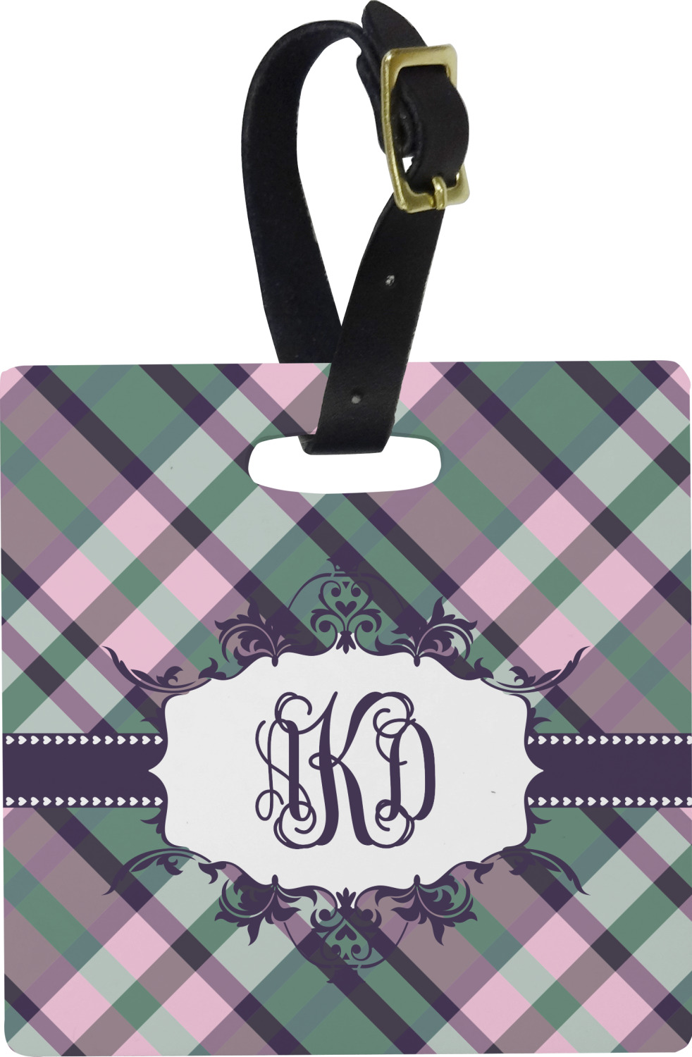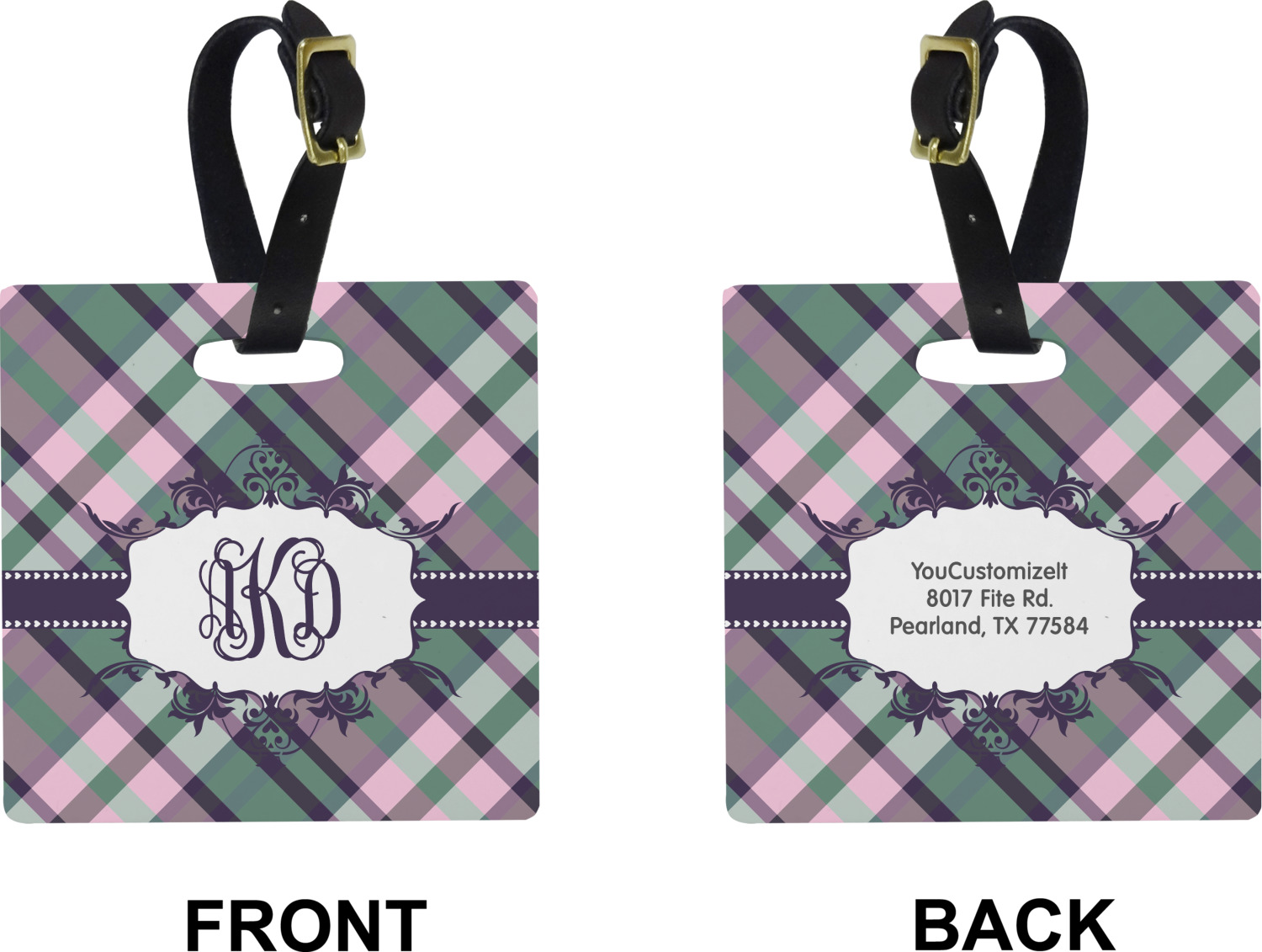These personalized bag tags are sold in a variety of shapes, so that you may find the product that meets your vision exactly. We sell a round luggage tag, which measures at approximately 4" x 4". Our square luggage tag is about 3.5" x 3.5", while our rectangular version is 2.75" x 4 ".
