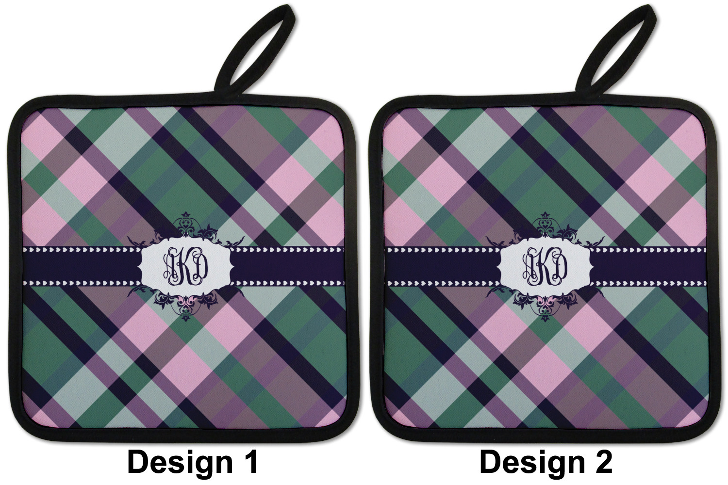 Our personalized pot holders feature a neoprene front that displays your personalization in vibrant colors. The backing of the hot pot holder is rubberized; the textured backing allows you to have a great grip when using this custom pot holder. The two materials are joined with a sleek, black trim, and the holder also includes an attached loop for hanging and storage. The pot holder is approximately 8.75 inches by 8.75 inches and 0.25 inches tall, while the fabric loop is 2.5 inches long. You can purchase a kitchen pot holder by itself or as a set of 2. We also offer a set including one pot holder and one oven mitt.