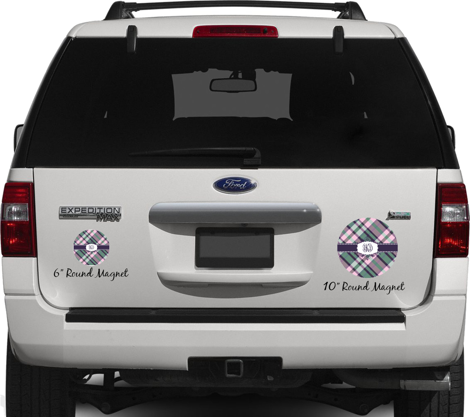 Your personalized car magnets are available for purchase in two shapes and two sizes. We carry round and square editions; each shape can either be 6 by 6 inches, or 10 by 10 inches, depending on your needs. Both versions are 1 millimeter thick, which is considered, within the industry, as the ideal thickness for automobile magnets. The magnetic car decals will adhere to any smooth, metal surface of your cars body, such as the trunk door or a side panel. However, please note that some vehicles are constructed from fiberglass bodies, which prevents the adhesion of anything magnetic. We advise that you test your vehicle before purchasing these magnets.