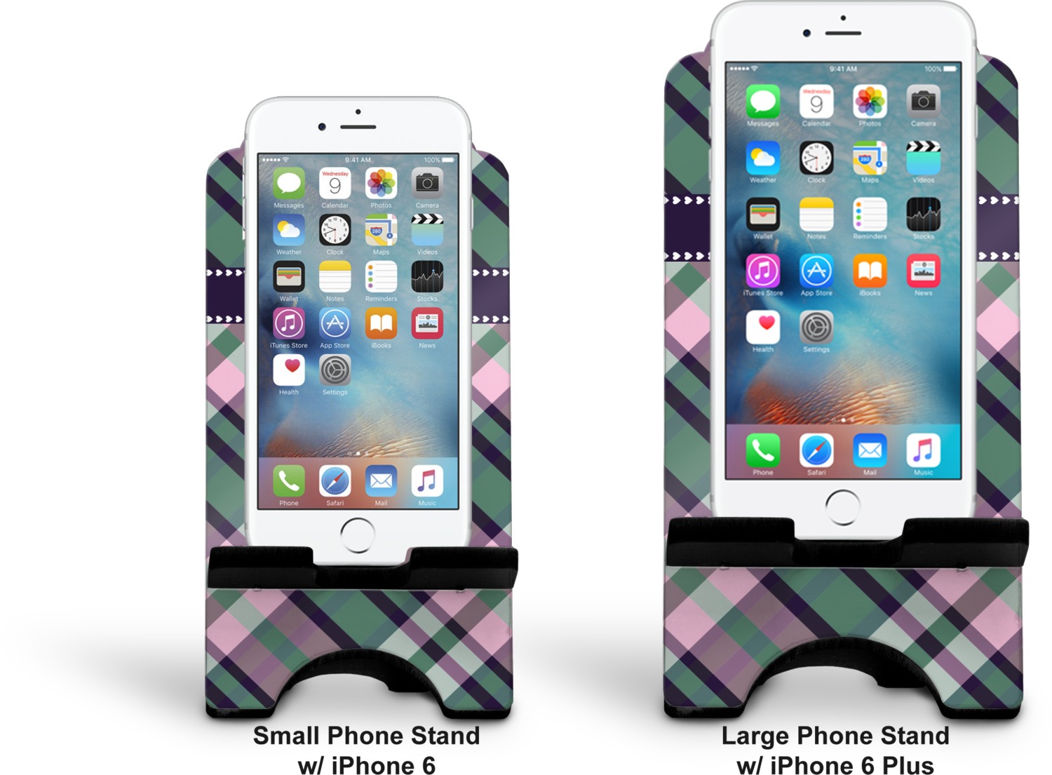 To meet your needs, we offer four variations of this IPhone stand. The backboard of the first version is shaped as a plain, yet sleek rectangle, and is available in two sizes. Our smaller size is approximately 4 by 3.25 by 7 inches, while the larger model is 4 by 3.77 by 8.5 inches. Alongside this model, we also provide you with a more decorative option. The upper part of our second version features a curved edge, for a classy, suave appearance. This phone holder is also sold in two sizes: a smaller version, which is 4 by 3.25 by 7 inches, and our larger model, which is 4 by 3.77 by 8.5 inches. Both models will support large phones, but the larger model is better if you wish to proudly display your personalized design.