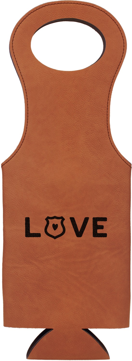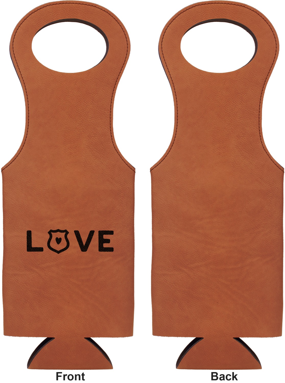 This wine carrier is made from a stunning leatherette, in a cognac-brown color. Strong, black stitching lines the sides of your wine bottle bag and provides extra durability. The interior is lined with a padded, black material to allow for a snug fit once your bottle is placed inside. At the top of this wine gift bag, you'll find two oval shaped handles that elegantly complements the rest of the bag's style. We provide you with the option of laser-engraving the front, or the front and back of your new personalized wine bag!