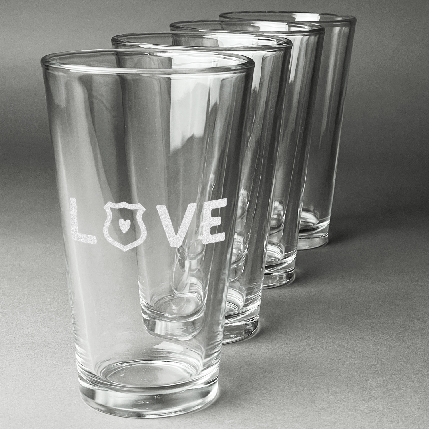 Available in a single glass or a set of 4 - each glass will be custom engraved with your design. Each glass holds 16 oz and measure 5.75"H x 3.5"W.