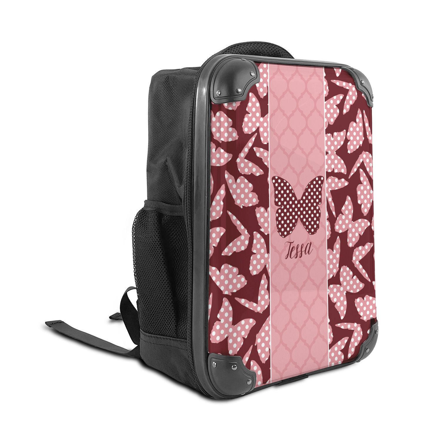 The design is split up in three parts with a polka dot butterfly pattern on either side of the middle section which has a subtle moroccan background. The foreground is personalized with a name and a fun polka dotted butterfly graphic above it. The blush and maroon compliment each other quite nicely. Easily change any of these design elements within the design center.