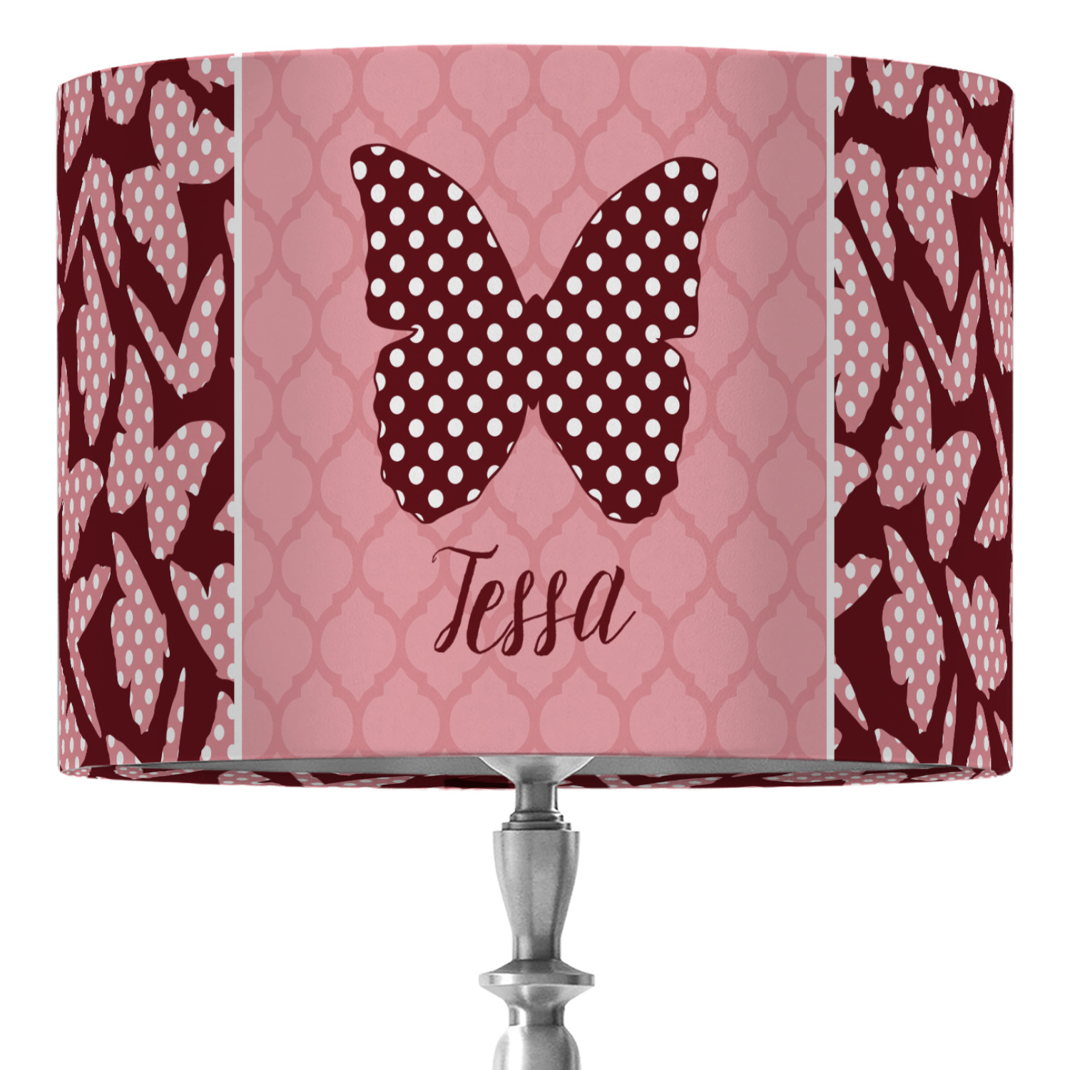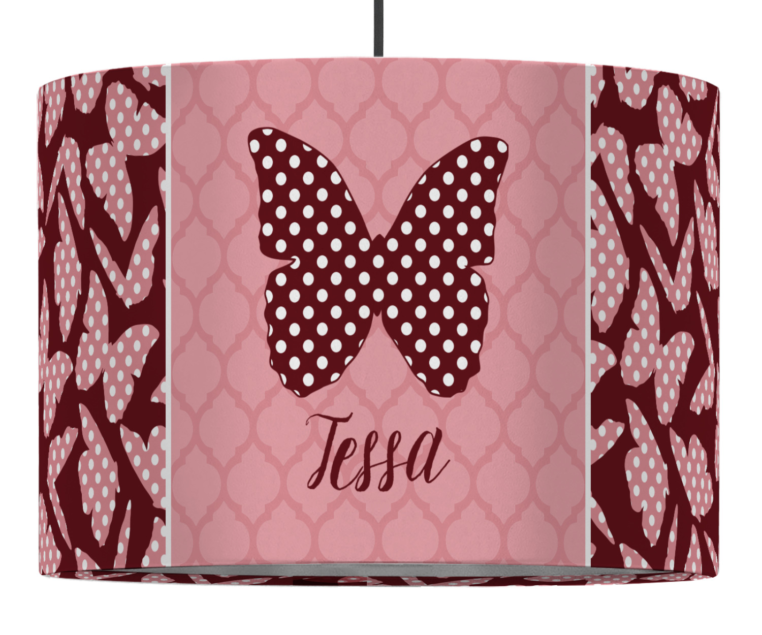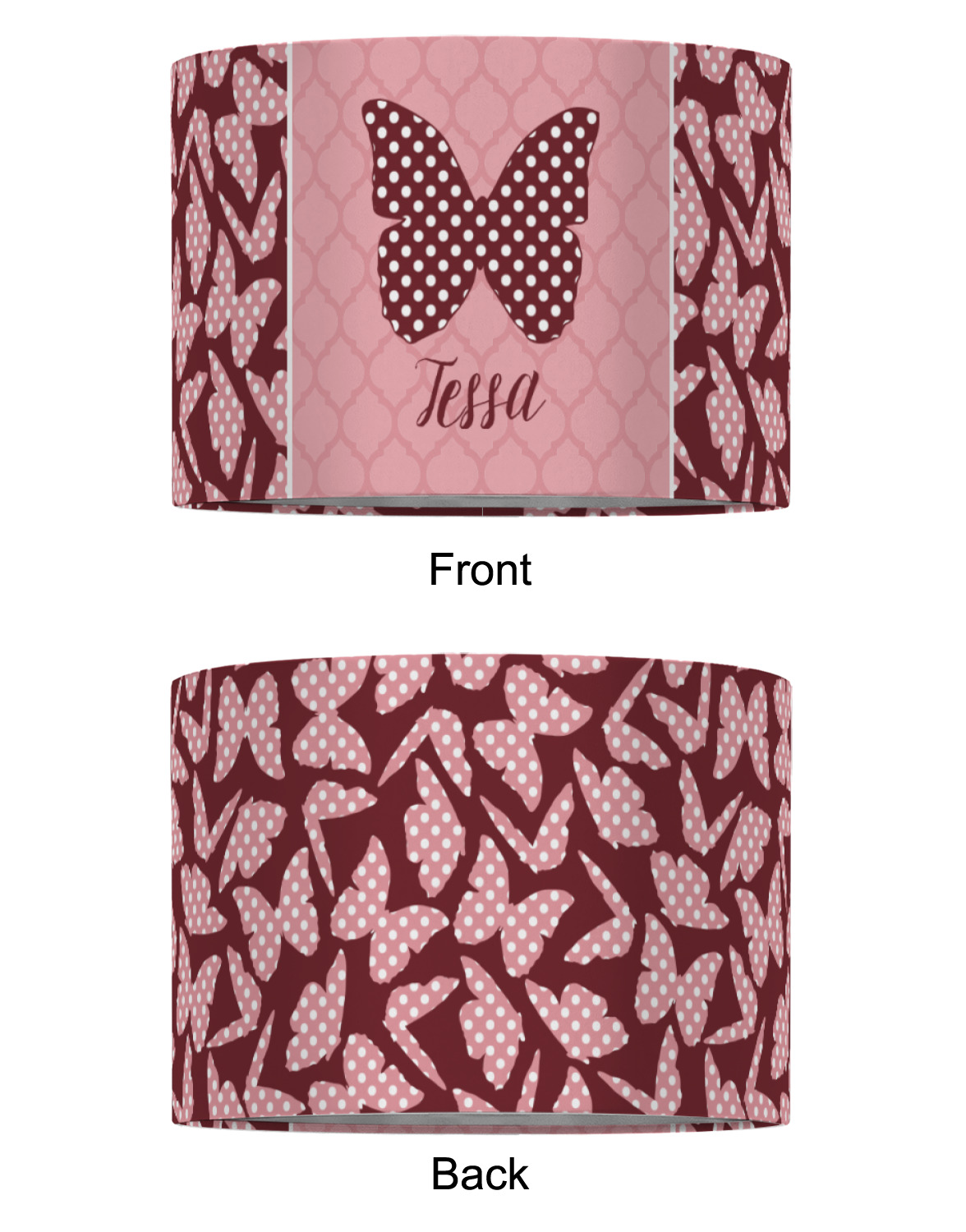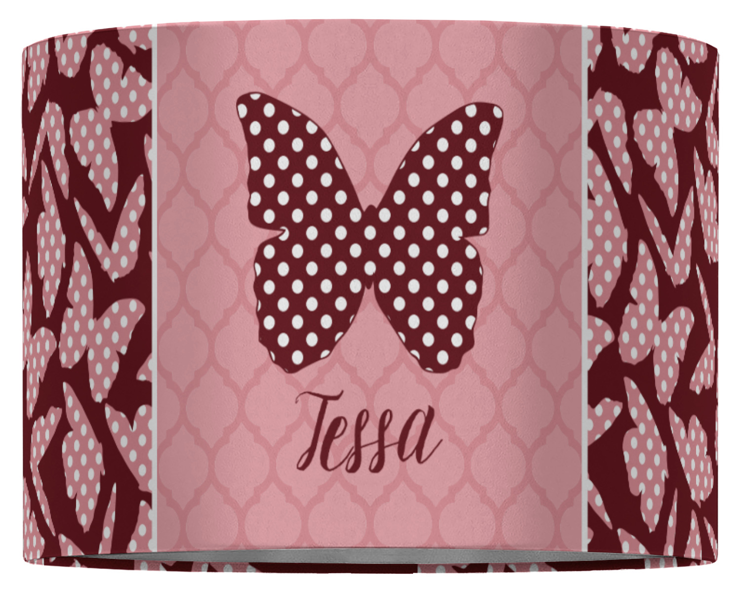 The design is split up in three parts with a polka dot butterfly pattern on either side of the middle section which has a subtle moroccan background. The foreground is personalized with a name and a fun polka dotted butterfly graphic above it. The blush and maroon compliment each other quite nicely. Easily change any of these design elements within the design center.