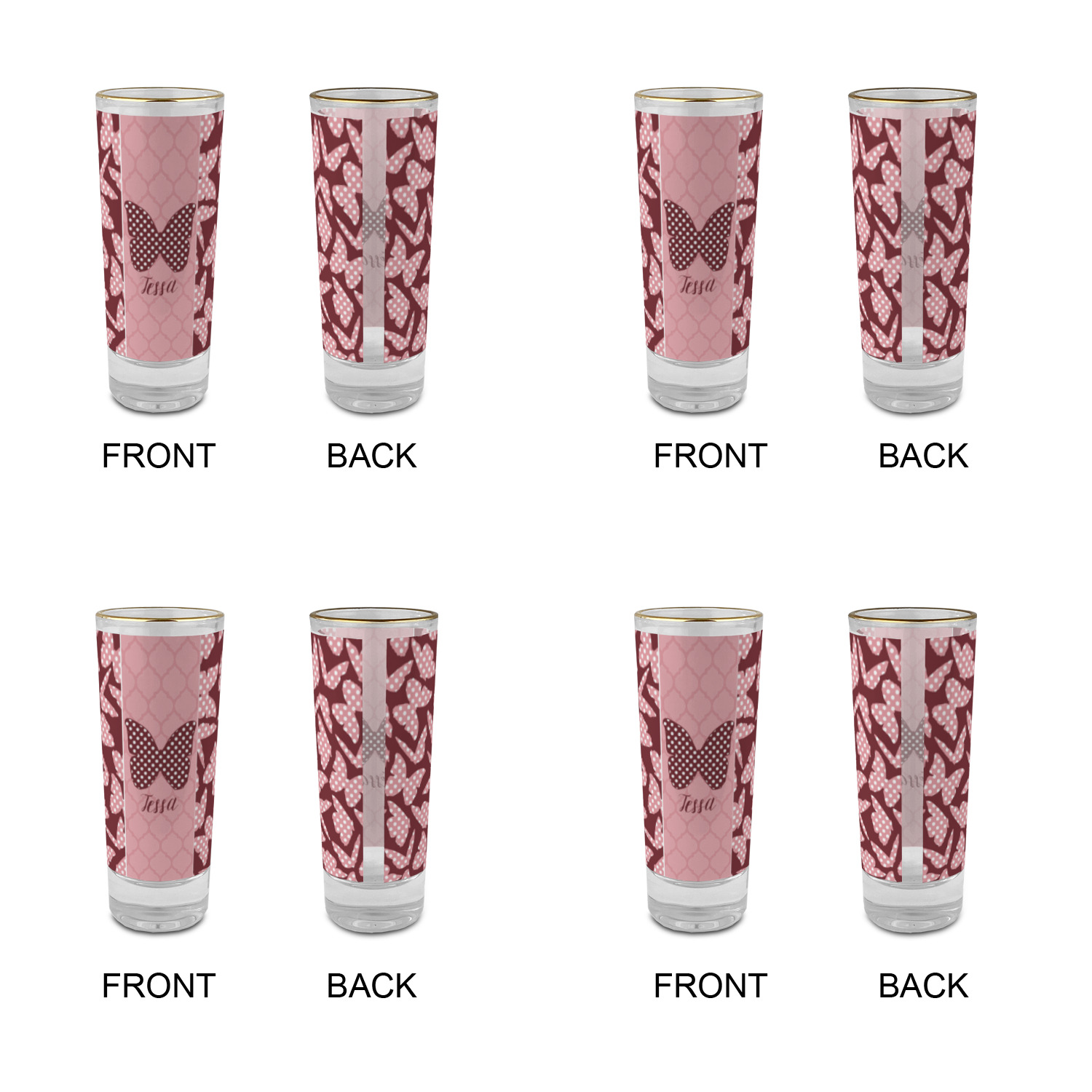 These glass shooter glasses are printed in full color with the design of your choice. These are a tall shooter 2 oz size and stand 4" tall. The print is a full wrap design to boldly display your personalization.