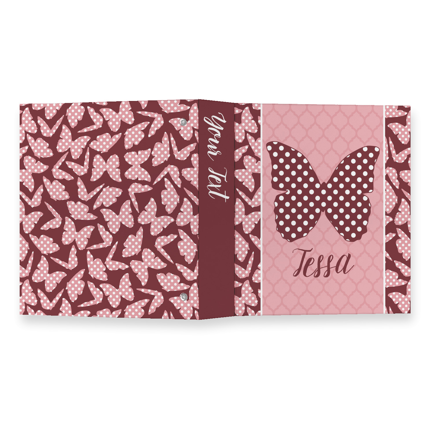 The design is split up in three parts with a polka dot butterfly pattern on either side of the middle section which has a subtle moroccan background. The foreground is personalized with a name and a fun polka dotted butterfly graphic above it. The blush and maroon compliment each other quite nicely. Easily change any of these design elements within the design center.