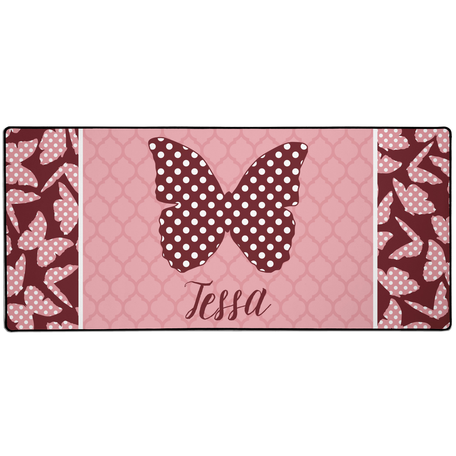 The design is split up in three parts with a polka dot butterfly pattern on either side of the middle section which has a subtle moroccan background. The foreground is personalized with a name and a fun polka dotted butterfly graphic above it. The blush and maroon compliment each other quite nicely. Easily change any of these design elements within the design center.