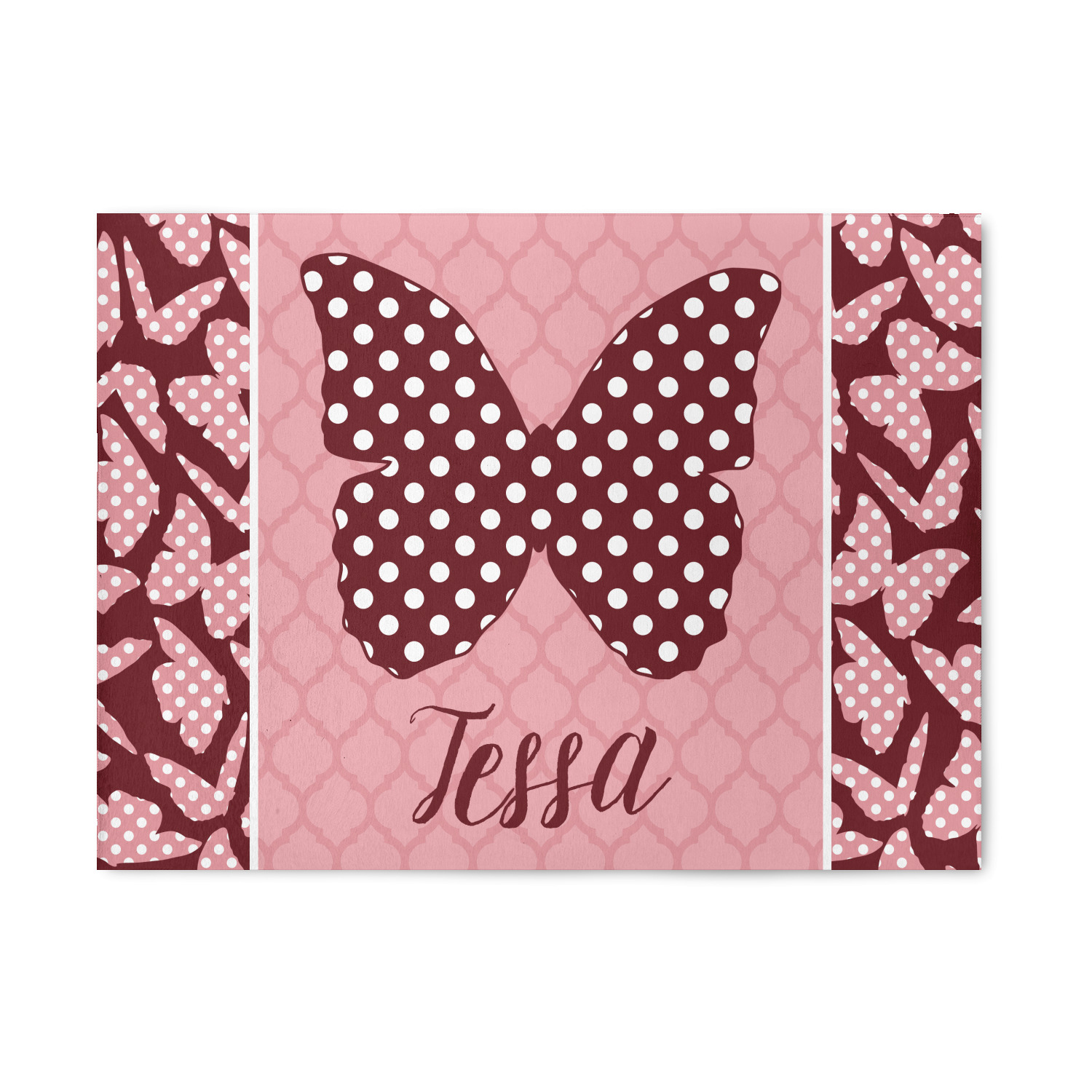 The design is split up in three parts with a polka dot butterfly pattern on either side of the middle section which has a subtle moroccan background. The foreground is personalized with a name and a fun polka dotted butterfly graphic above it. The blush and maroon compliment each other quite nicely. Easily change any of these design elements within the design center.