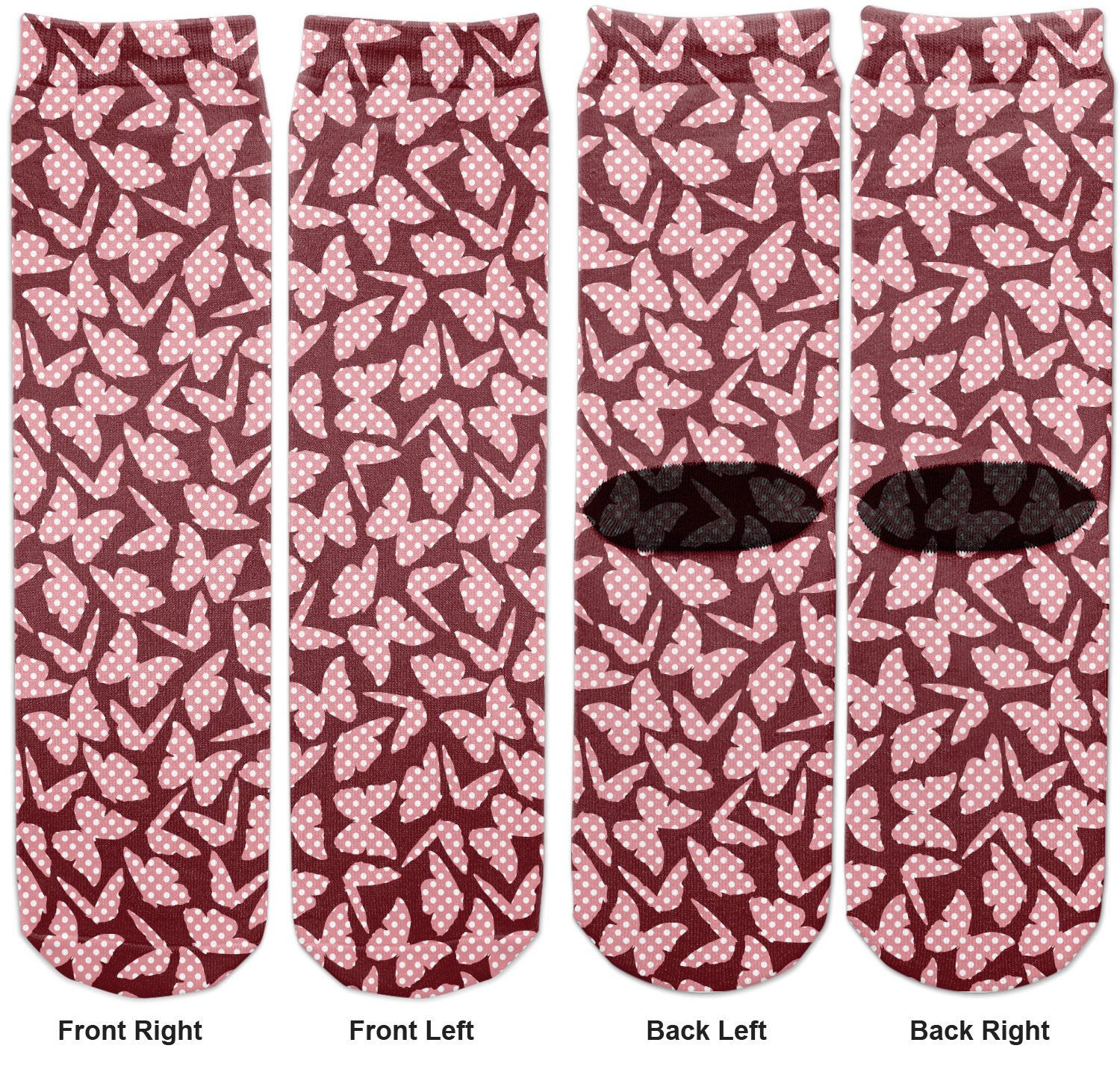 The design is split up in three parts with a polka dot butterfly pattern on either side of the middle section which has a subtle moroccan background. The foreground is personalized with a name and a fun polka dotted butterfly graphic above it. The blush and maroon compliment each other quite nicely. Easily change any of these design elements within the design center.