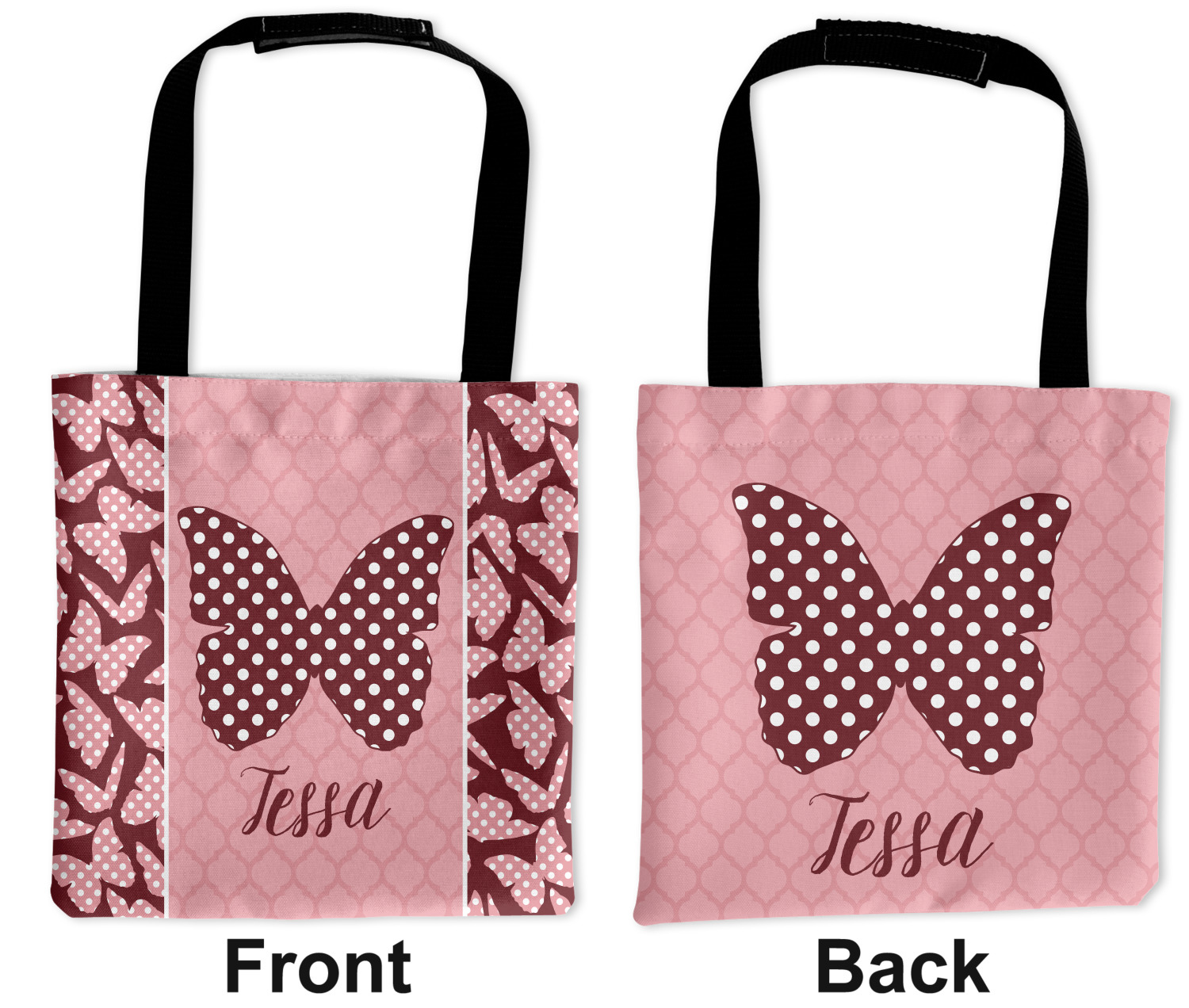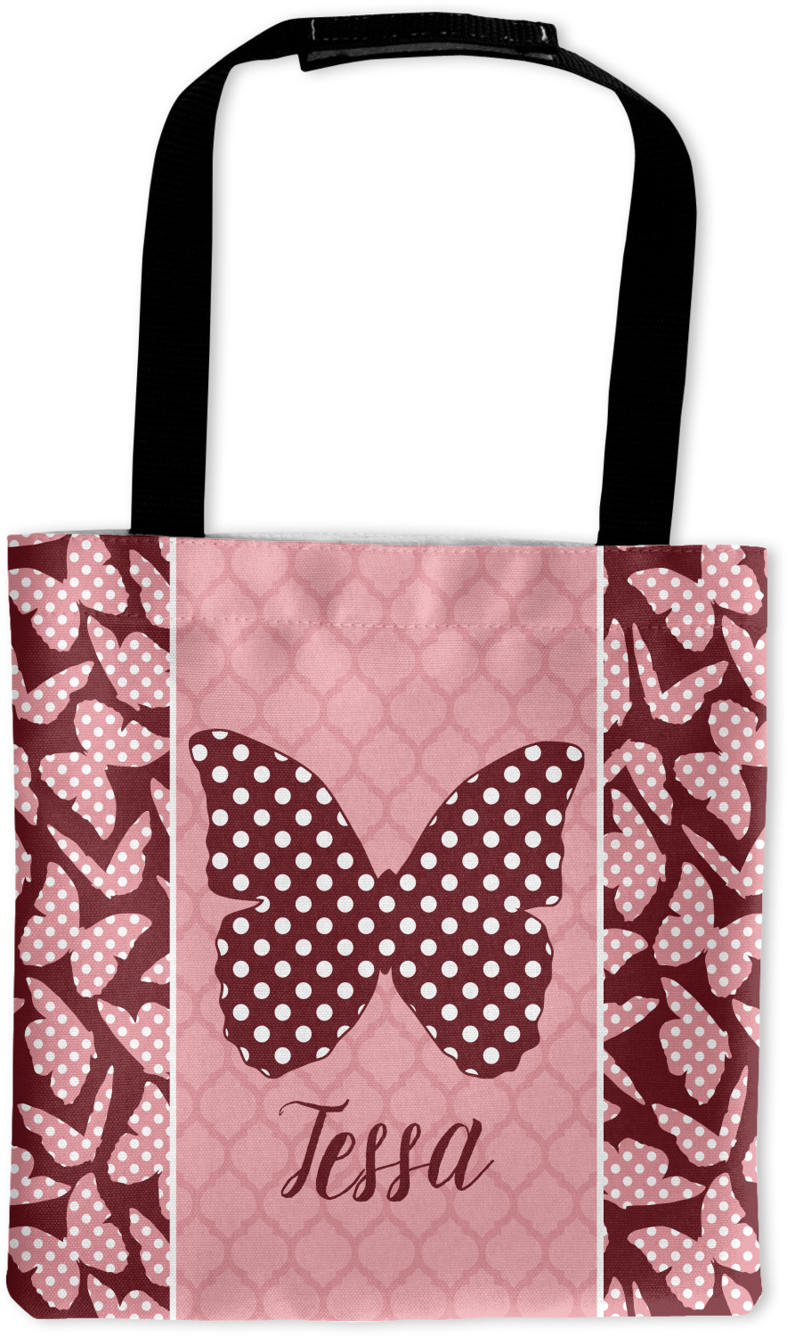 The design is split up in three parts with a polka dot butterfly pattern on either side of the middle section which has a subtle moroccan background. The foreground is personalized with a name and a fun polka dotted butterfly graphic above it. The blush and maroon compliment each other quite nicely. Easily change any of these design elements within the design center.