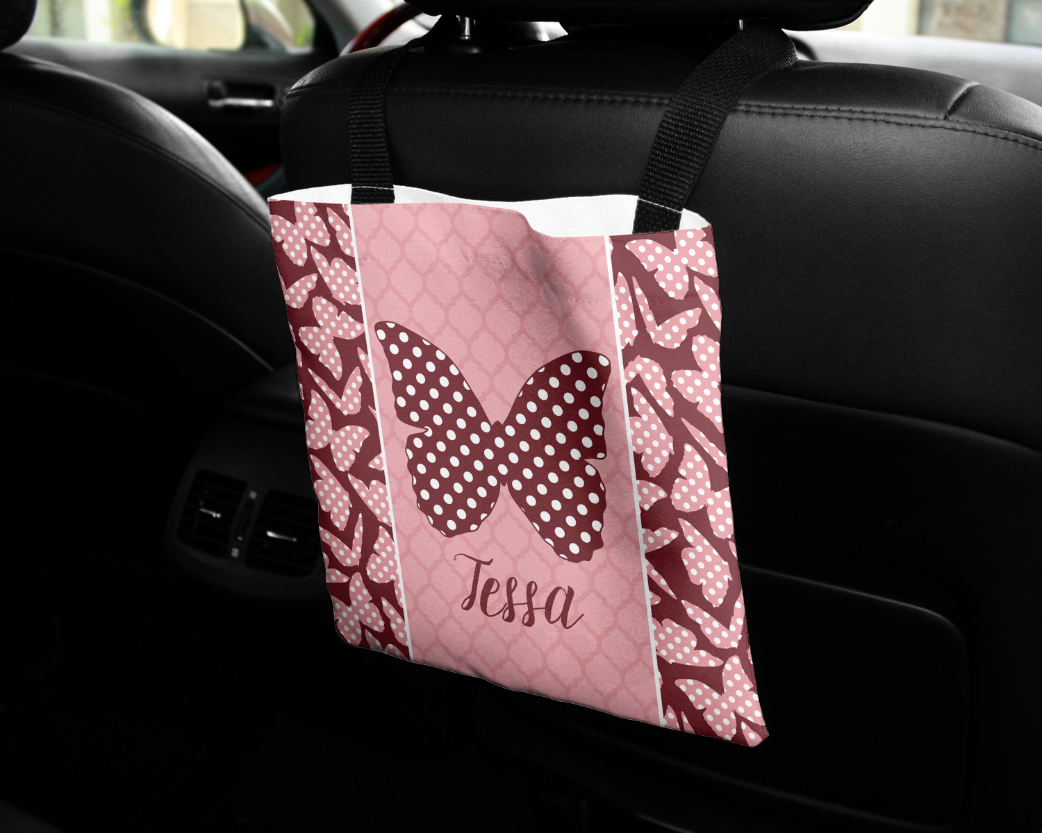 These car back seat organizers are sturdy tote-like bags, fabricated from a robust polyester, and features a single handle on the back side. The strap features an attachable velcro for easy attachment to headrests, grocery carts, car seats, and more. Simply undo the velcro, loop the strap around the headrest, reattach the velcro, and let the organizer hang from the front seat. These car organizers are the perfect means of increasing your backseat's legroom, while storing multiple items in one place for better accessibility. Each car back seat organizer measures at 10 by 10 inches, and features your personalized design printed across its front and back.