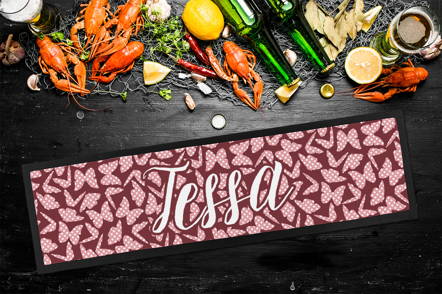 The design is split up in three parts with a polka dot butterfly pattern on either side of the middle section which has a subtle moroccan background. The foreground is personalized with a name and a fun polka dotted butterfly graphic above it. The blush and maroon compliment each other quite nicely. Easily change any of these design elements within the design center.