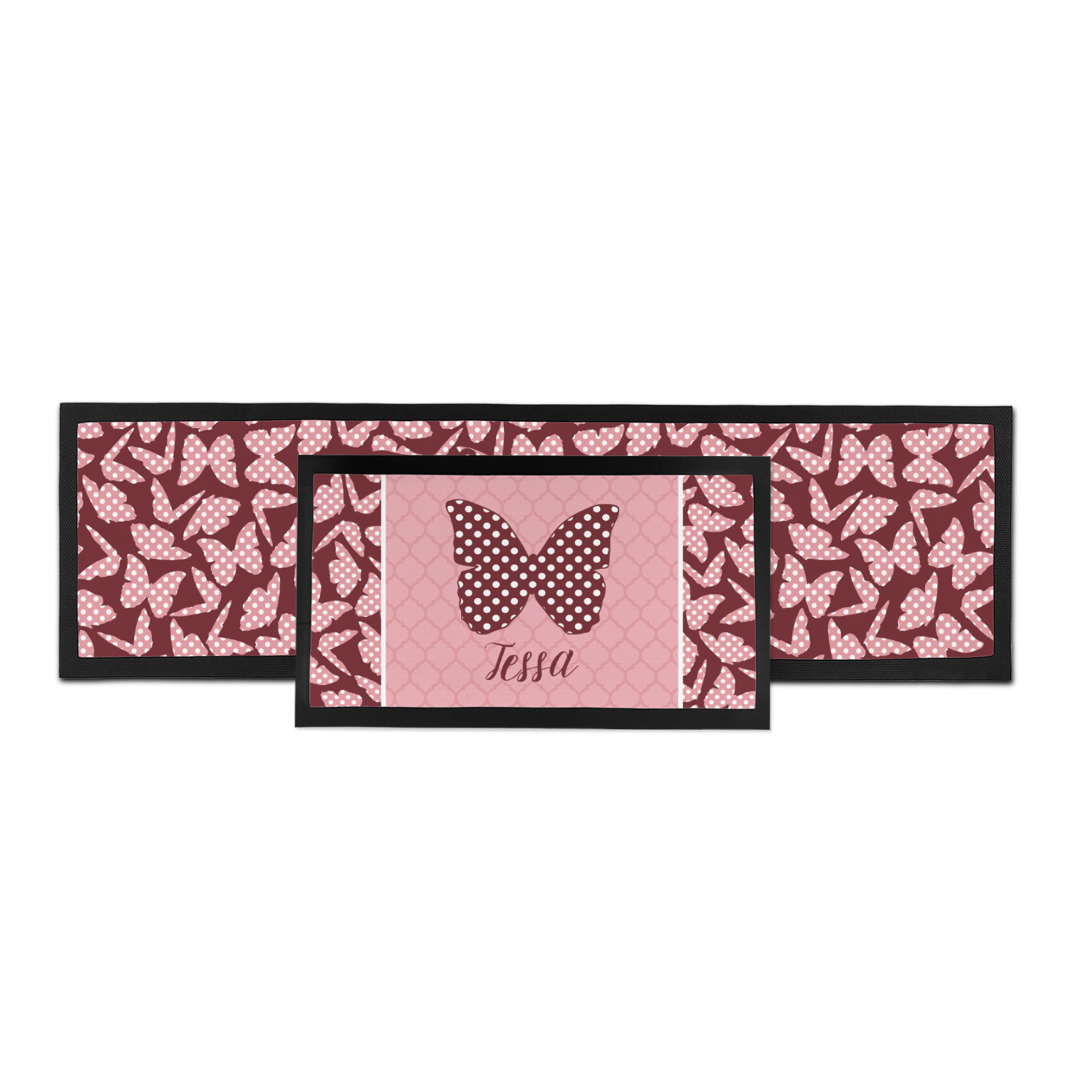 The design is split up in three parts with a polka dot butterfly pattern on either side of the middle section which has a subtle moroccan background. The foreground is personalized with a name and a fun polka dotted butterfly graphic above it. The blush and maroon compliment each other quite nicely. Easily change any of these design elements within the design center.